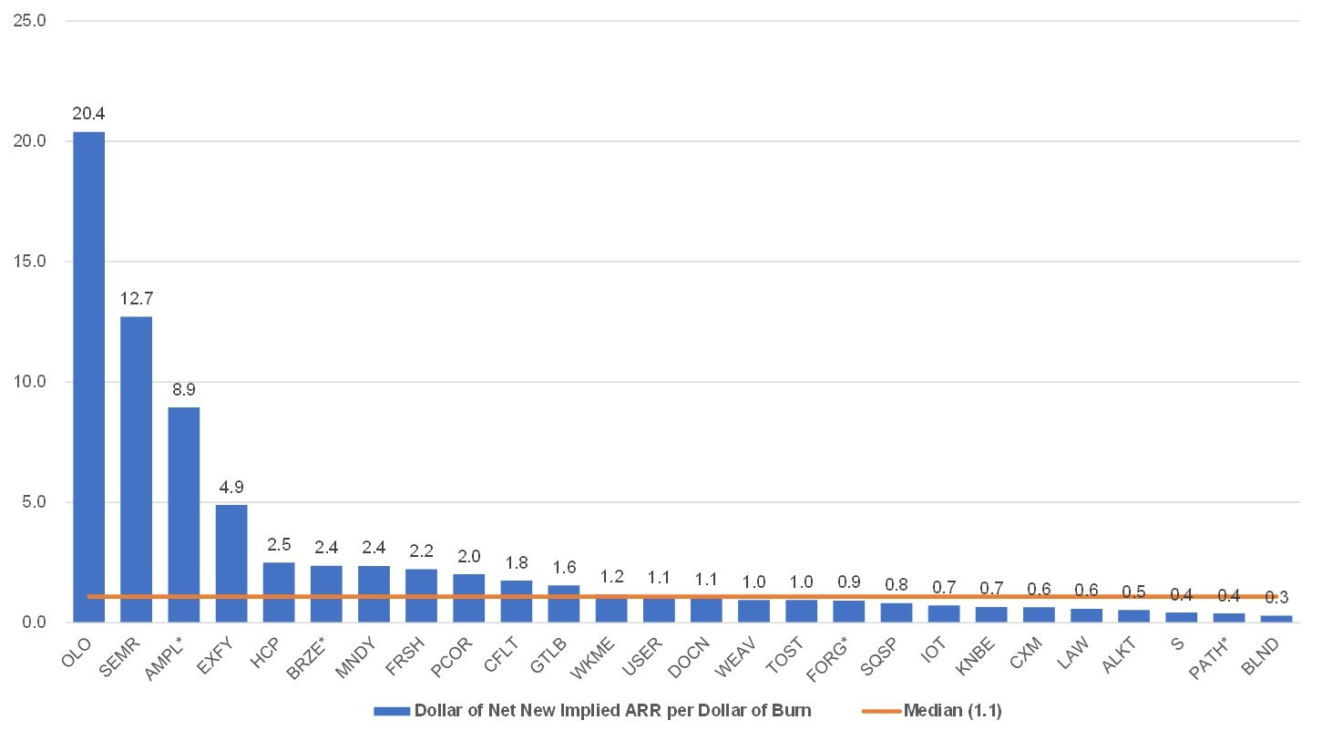 The following looks at the ratio of each company’s implied ARR at IPO quarter to their implied net cash burn (inclusive of total equity capital raised, debt and acquisitions). The median is 1.1 but some companies like Olo, SEMrush and Amplitude* had significant positive ratios.