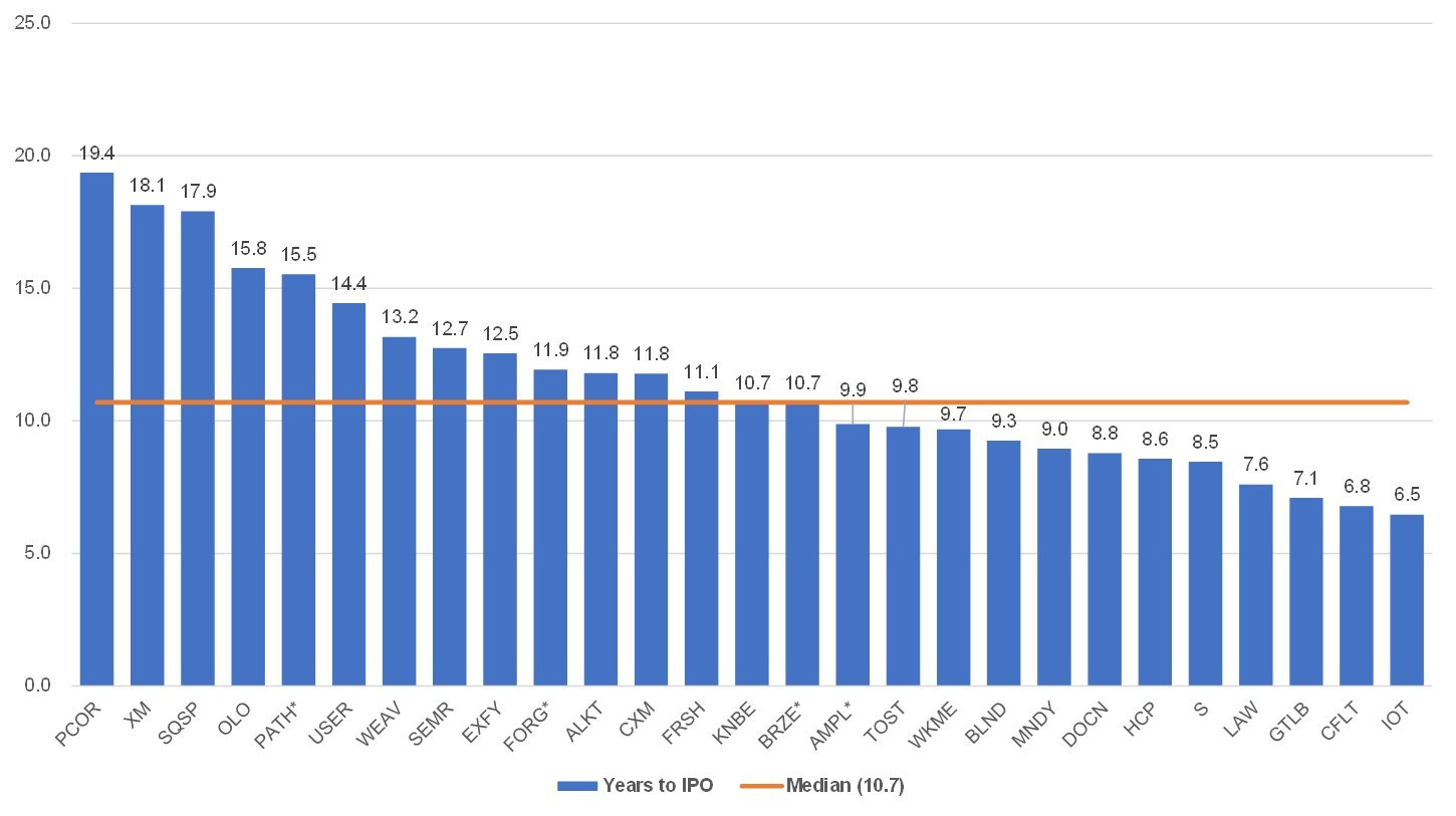 How long did it take to IPO? The below chart has years from founding to IPO year -- the median is 10.7 years.