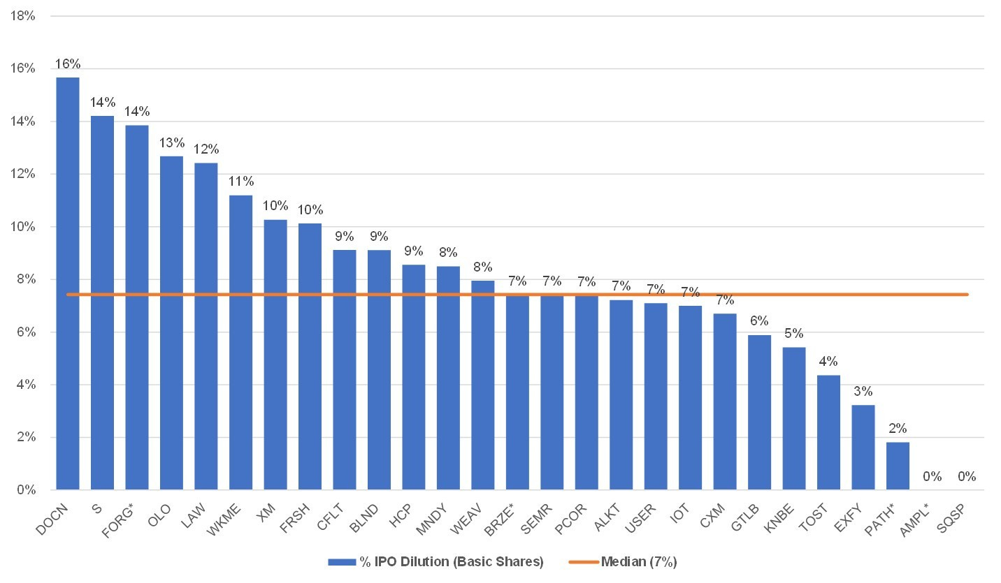 Given IPOs are financing rounds, companies sell new primary shares to public market investors. The median dilution from IPO for this group of companies was 7%. Again, given Amplitude* and Squarespace went public through direct listings they did not issue new primary shares.