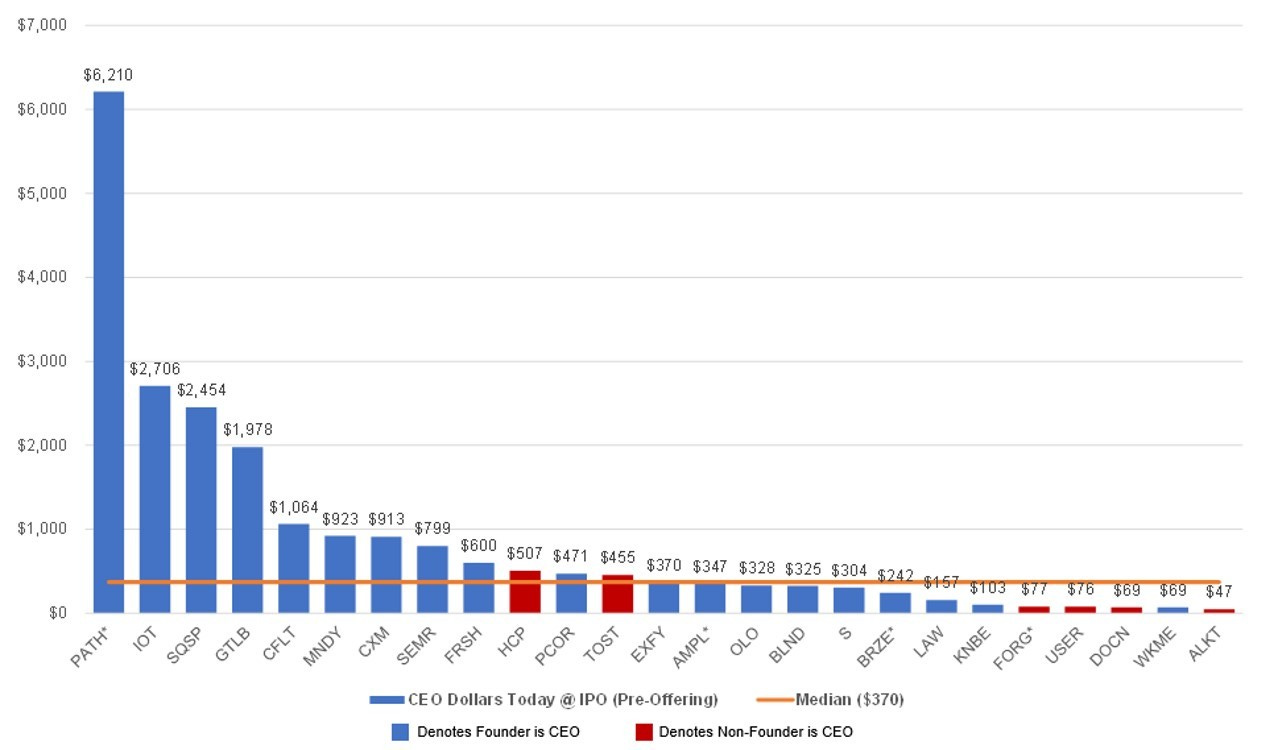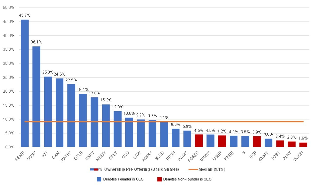 CEOs and employees at venture-backed companies usually take a significant amount of dilution as companies raise more equity capital to fund their growth. The median CEO ownership pre-offering was 9.1% for this group of companies. Red columns below denote founder CEOs and not surprisingly, CEOs who are founders own more of their respective companies at IPO. The median for founder CEOs is 10.6% and the median for non-founder CEOs is 2.2%. Weave and Qualtrics are not included as at the time of IPO the CEO’s vested shares were <1% and not reported.