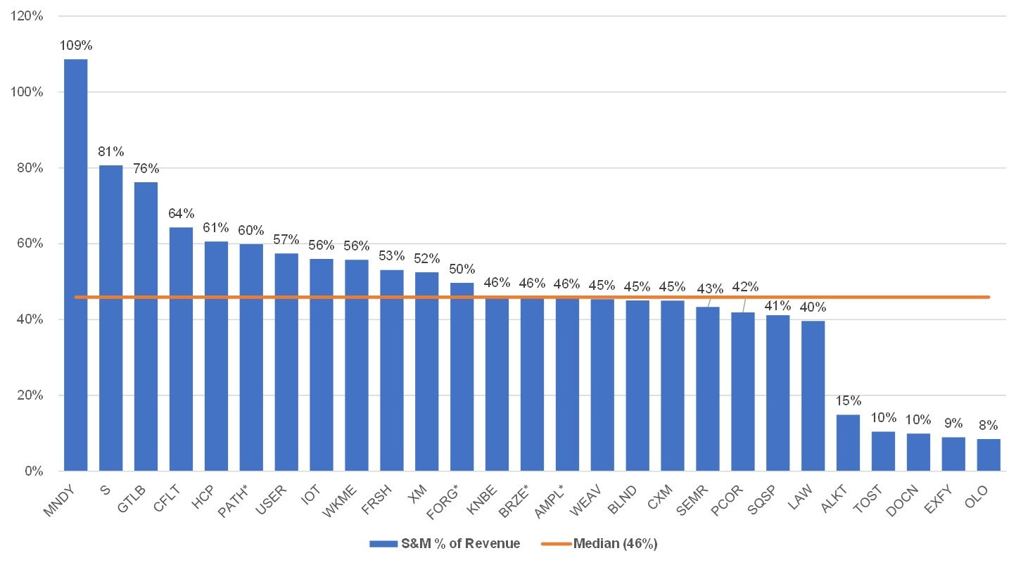 The median LTM sales and marketing as a % of revenue for this group is 46%. Sales and marketing is generally the highest operating expense line item for SaaS companies.