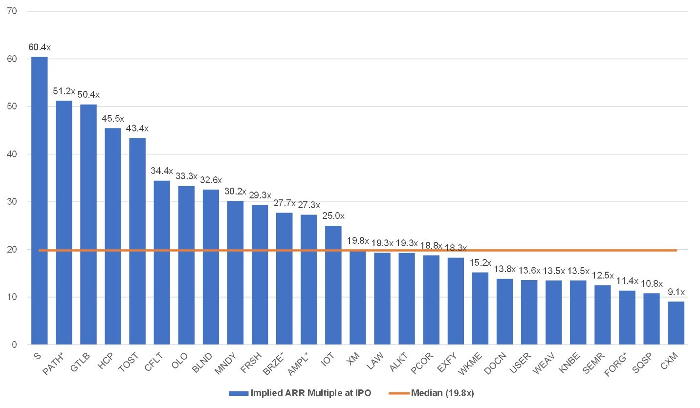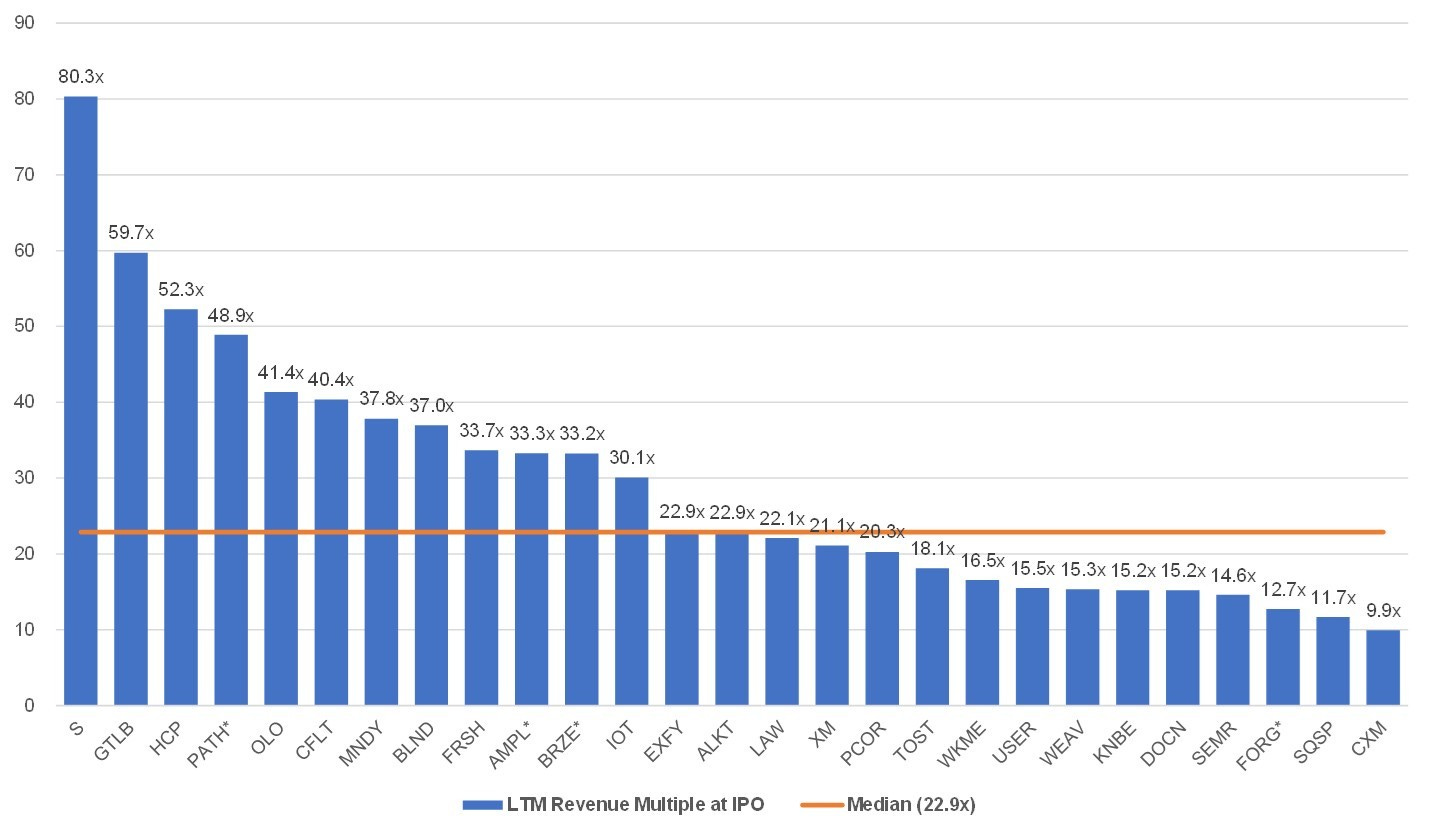 Companies do not release projections in S-1’s and while most companies have forward estimates today, the following looks at enterprise value at IPO price / reference price divided by LTM revenue as to include all companies. The median multiple is 22.9x.