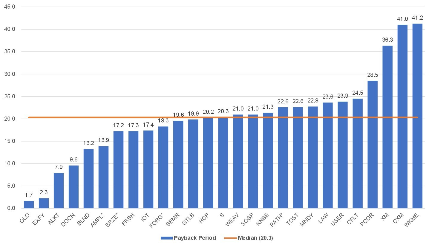 It’s hard to benchmark precise customer acquisition costs across companies since most companies don’t report new customer adds per quarter, but it’s possible to standardize and find the months to payback using the inverse of a CAC ratio (LTM implied net new ARR * LTM gross margin / LTM sales and marketing spend starting in the prior quarter), which is outputted below for each company. The median is 20.3 months.