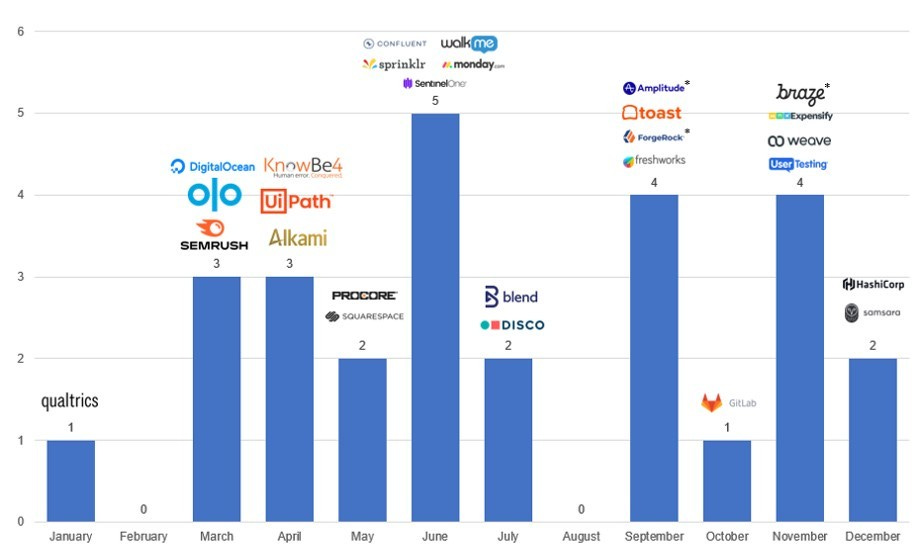 The chart below shows the number of SaaS IPOs by month in 2021 and the associated logos.
