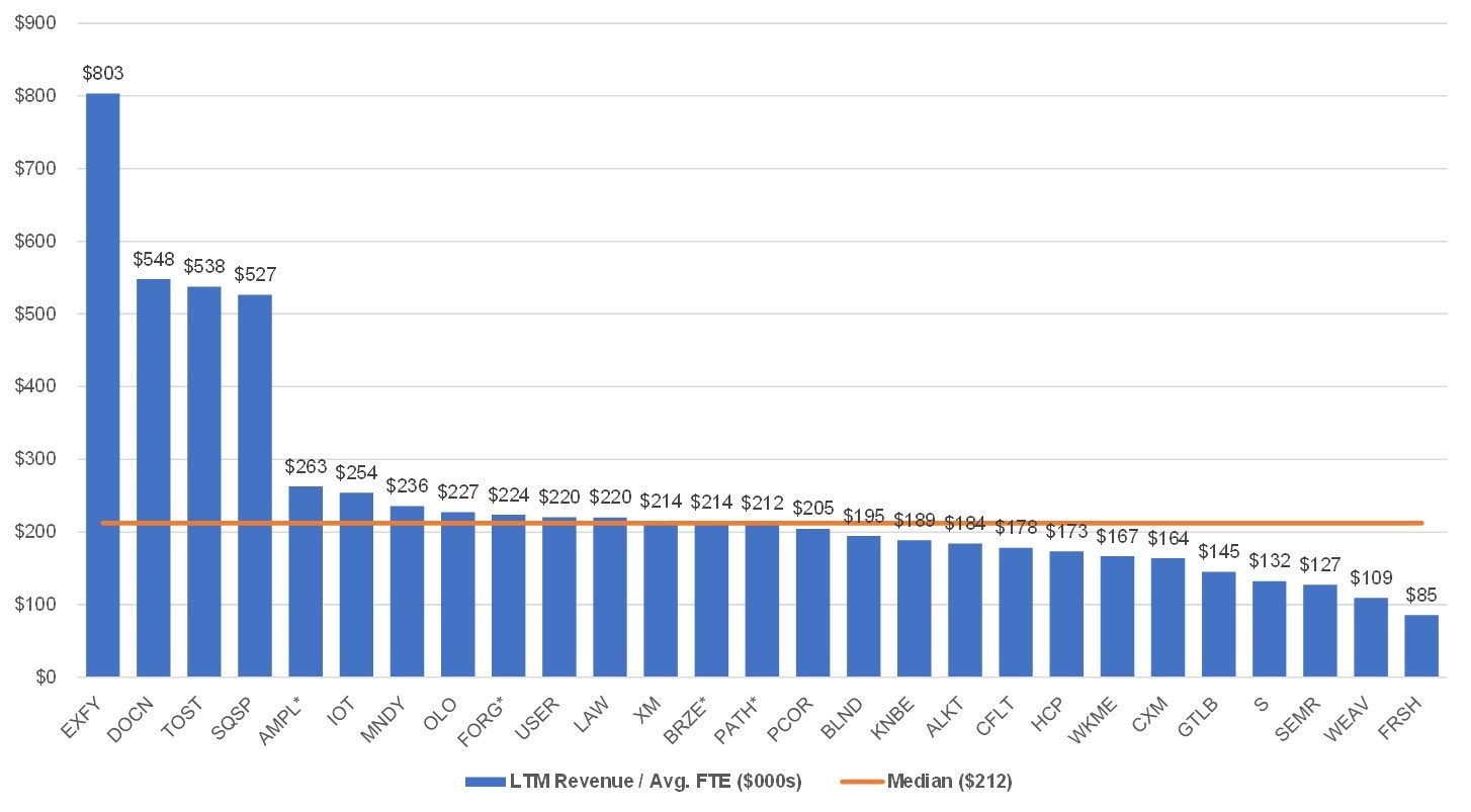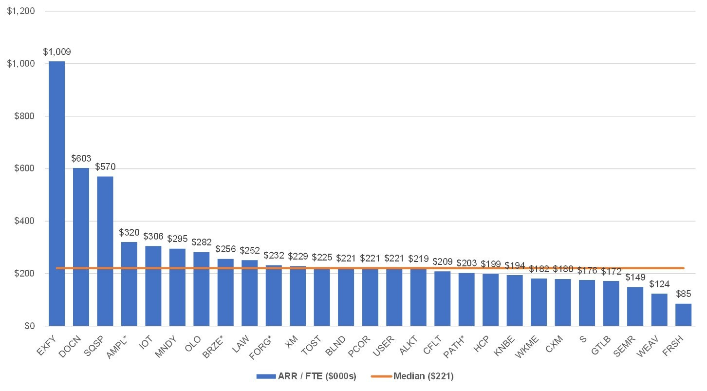 While the number of employees is helpful to assess scale, revenue per employee is a good proxy for efficiency. Of course, each company has a different product, market, delivery model, price, and end-customer, so this metric may not be perfectly comparable across the group but is still interesting to evaluate. Expensify really stands out ($803K) and the company only had 140 FTEs at IPO quarter. The median is $212K.