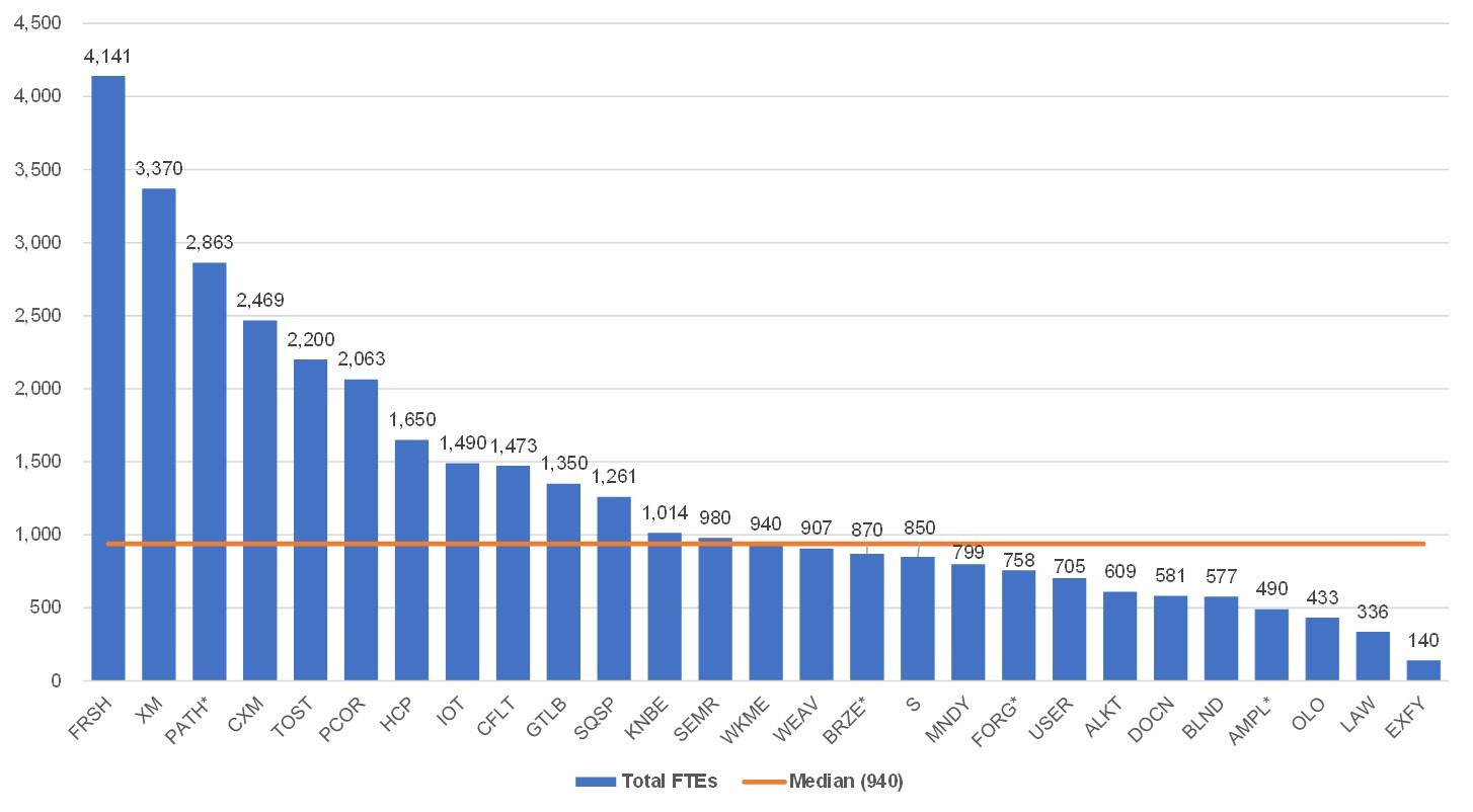 The scale of revenue varies widely in this group and so does the employee base. The median is 940 full-time employees.