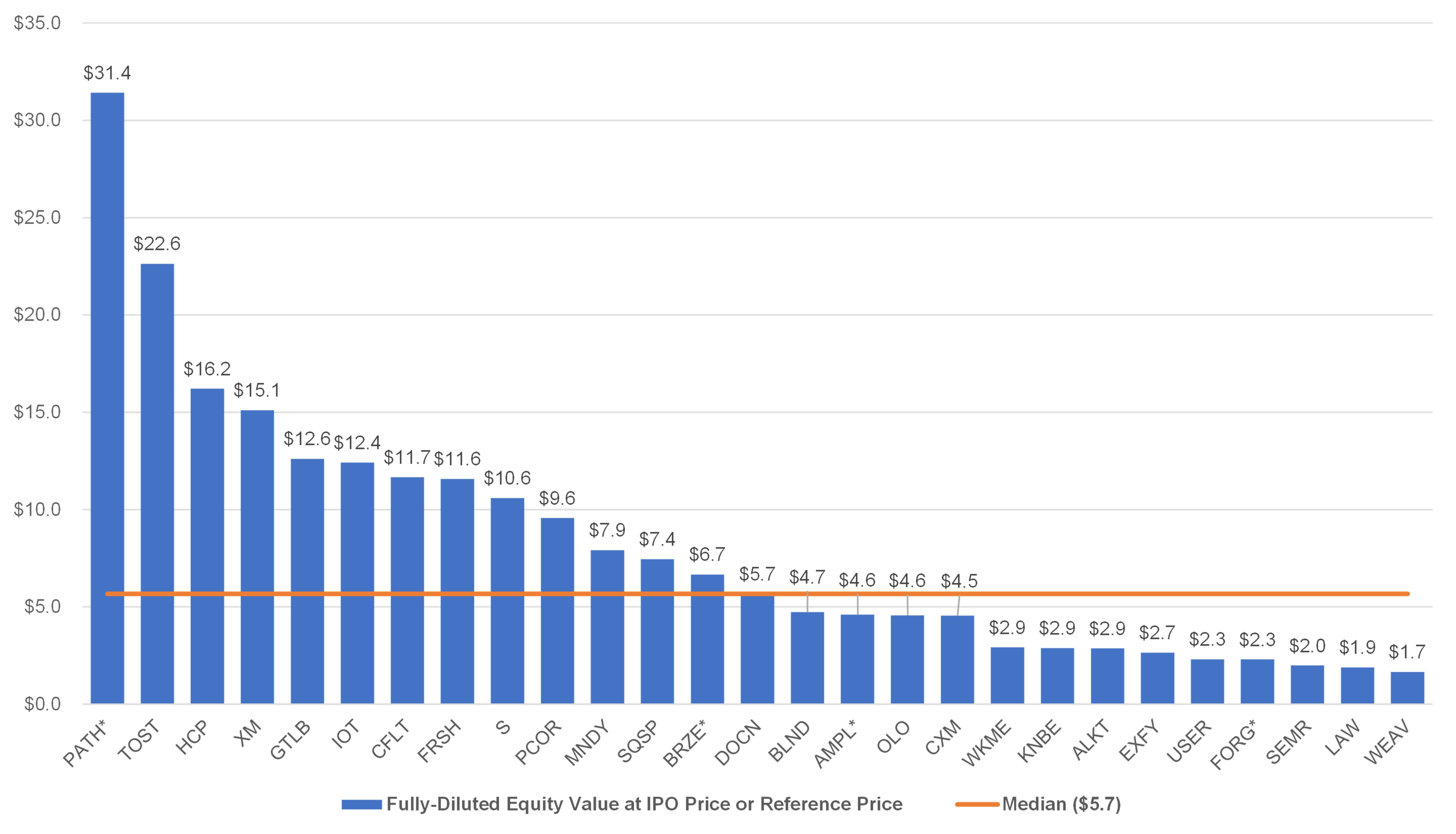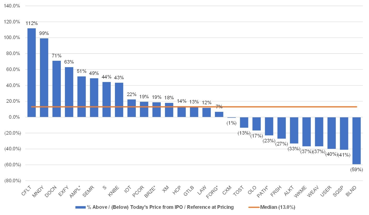 While many of these companies were up significantly from IPO / reference price, the past 8 weeks in the public markets has not been favorable for SaaS companies. As of 31-Dec-2021, the median increase from IPO price was 13% and 11 out of 27 companies -- 40% -- were trading below their IPO / reference price as of 31-Dec-2021. As of the same date, WalkMe, Blend Labs, Squarespace, and UiPath were also below their last reported private round valuation.
