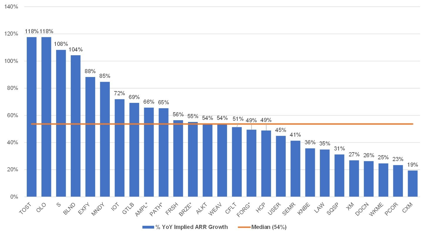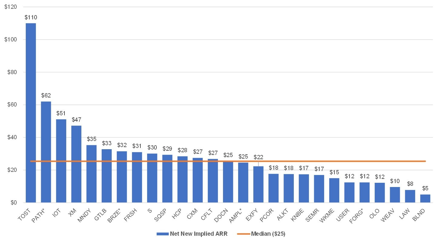 The chart below benchmarks how much net new implied ARR each company added during the last reported quarter in their filings before IPO. The median net new implied ARR added is $25M.