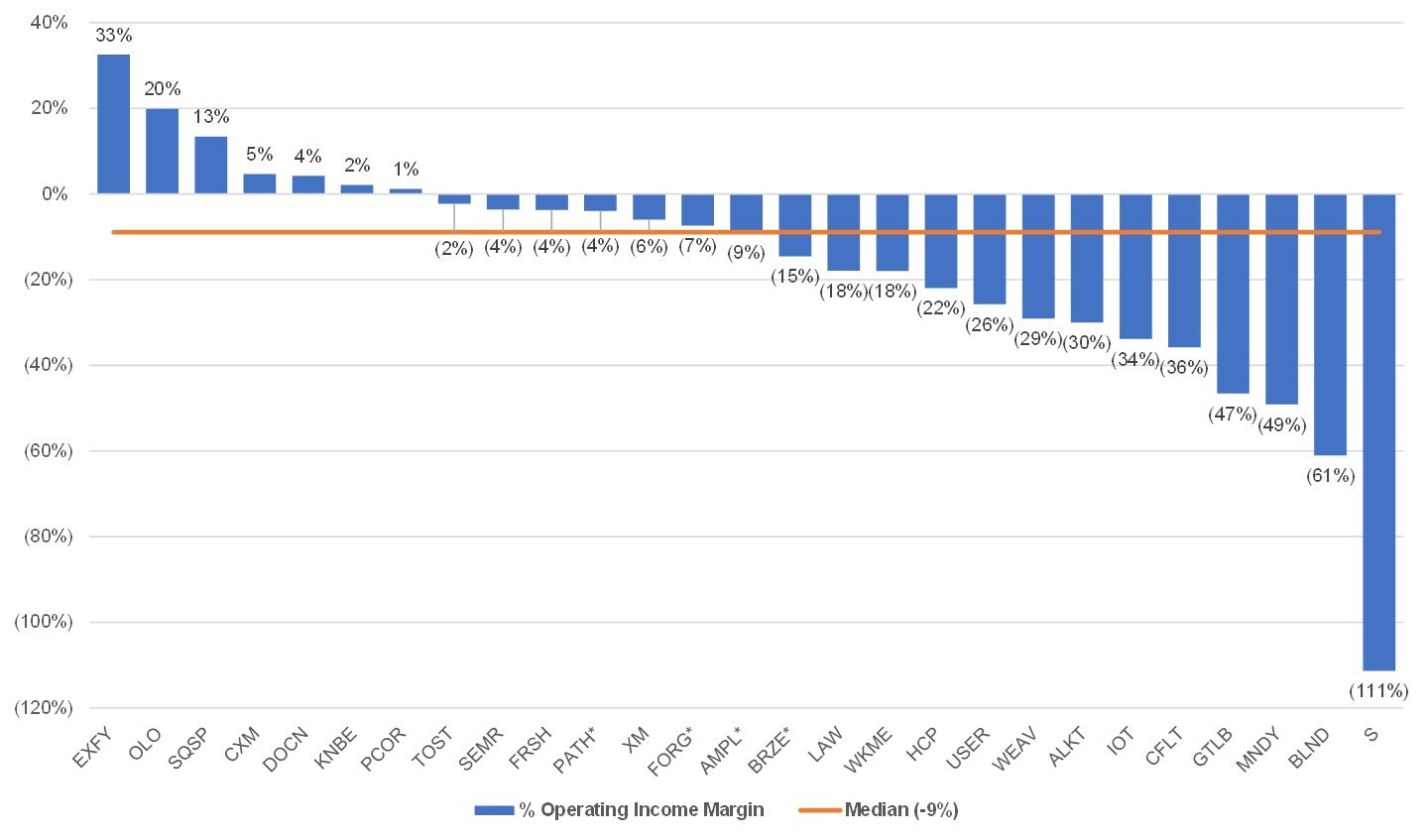 As expected, almost every company is losing money on a non-GAAP operating income basis and only 7 made money in the preceding 4 quarters of their respective IPOs. The median LTM non-GAAP operating margin was (9)%.