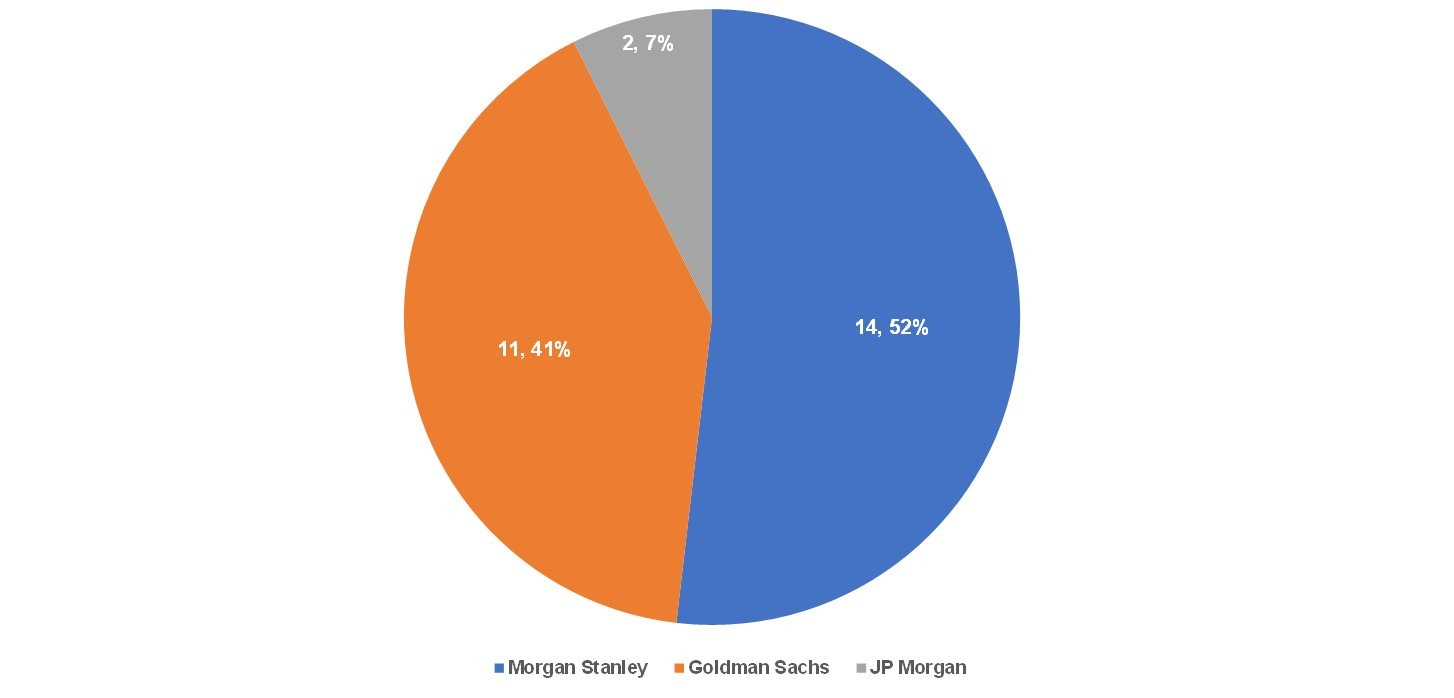 Investment banks underwrite traditional IPOs and “advise” in Direct Listings with the coveted spot being the lead left on the cover of the S-1. Morgan Stanley and Goldman Sachs usually take the left lead slots for technology companies and this group of companies is no different. Morgan Stanley was the leading underwriter and advisor with 52% of the lead position mandates from this group.