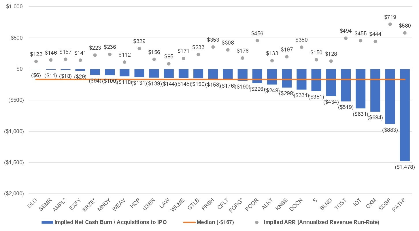 This chart represents the implied net cash burn (inclusive of total equity capital raised, debt and any acquisitions) to try and approximate how much these companies burned to get to IPO. Pitchbook is the source for total equity funding and the rest of the metrics are pulled from the S-1. Also represented on the chart is the implied ARR scale at IPO. Not surprisingly, companies that are larger at IPO burned more money on the path to IPO. The median net burn to get to IPO for this group was $(167M). Note Qualtrics was not included as they were spun out of SAP.