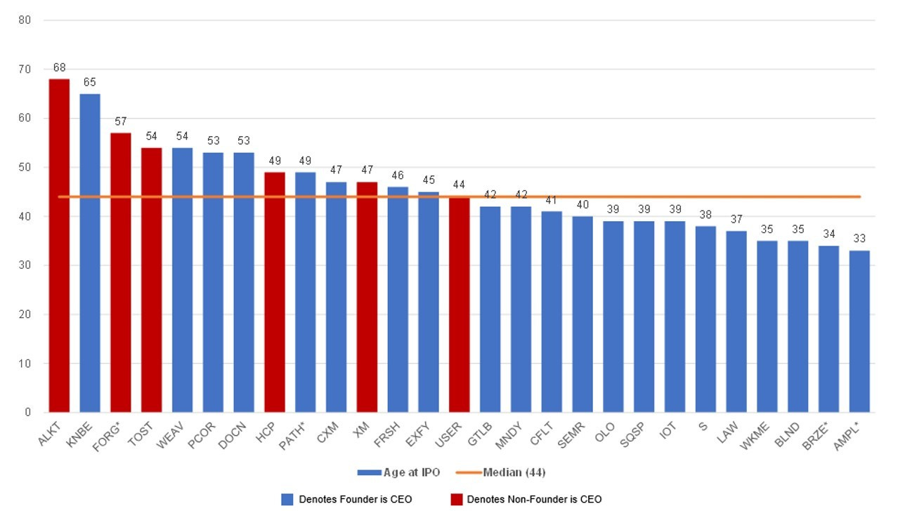The median age at IPO for a CEO was 44 years old.