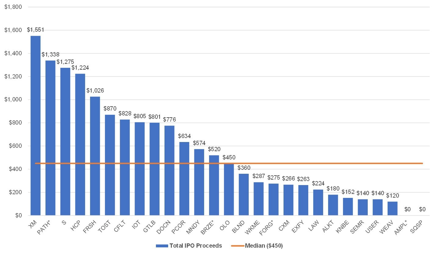 Each company also raised significant dollars from the public markets. The median offering size was $450M and this includes both primary and secondary shares. Two of the group did not raise capital since they utilized a direct listing (Amplitude* and Squarespace).