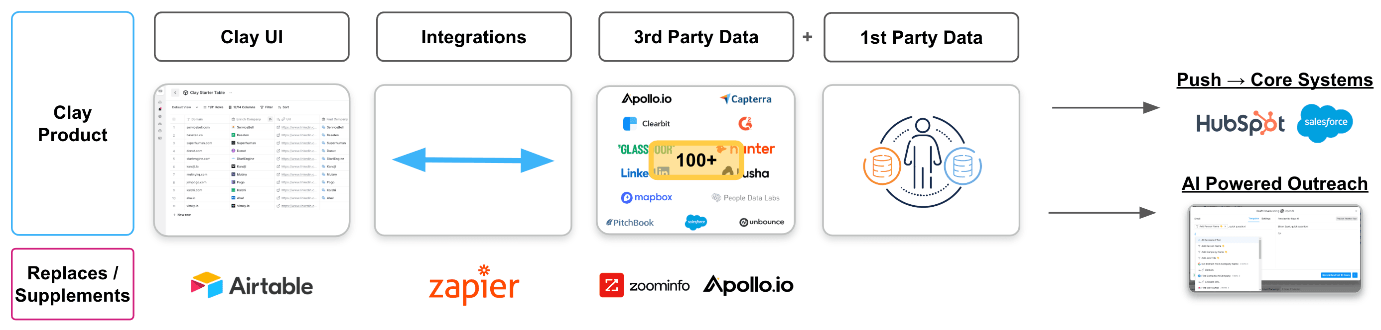 You may have heard Clay described as a GTM development environment, a creative tool for growth, a GTM Ops platform, or a growth hacker’s dream. Clay is an AI data enrichment and workflow automation platform that helps GTM teams unleash their creativity via more efficient, centralized work. But here’s what makes it special: for a long time, B2B growth has been tied to growing sales headcount, with roles like SDRs spending countless hours on manual research and outreach. Clay changes this equation.