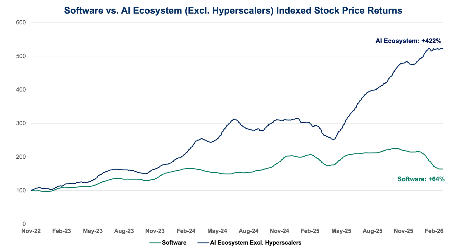 Software vs AI Ecosystem (Excl. Hyperscalers) — Indexed Stock Price Returns