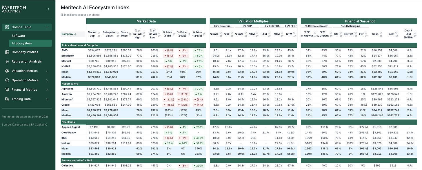 Historically, our Meritech Analytics product has focused solely on public software companies. No longer. We’ve expanded Meritech Analytics to include the Meritech AI Ecosystem Index. It includes almost 60 companies across key segments such as AI Accelerators and Compute, Hyperscalers, Neoclouds, Servers, AI Infra EMS, Networking and Connectivity, Semiconductor Equipment and Manufacturing, and Memory and Storage.