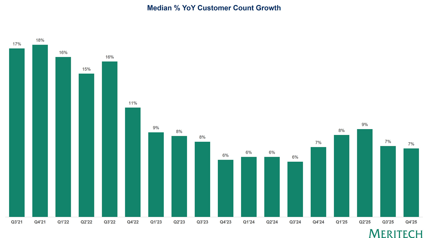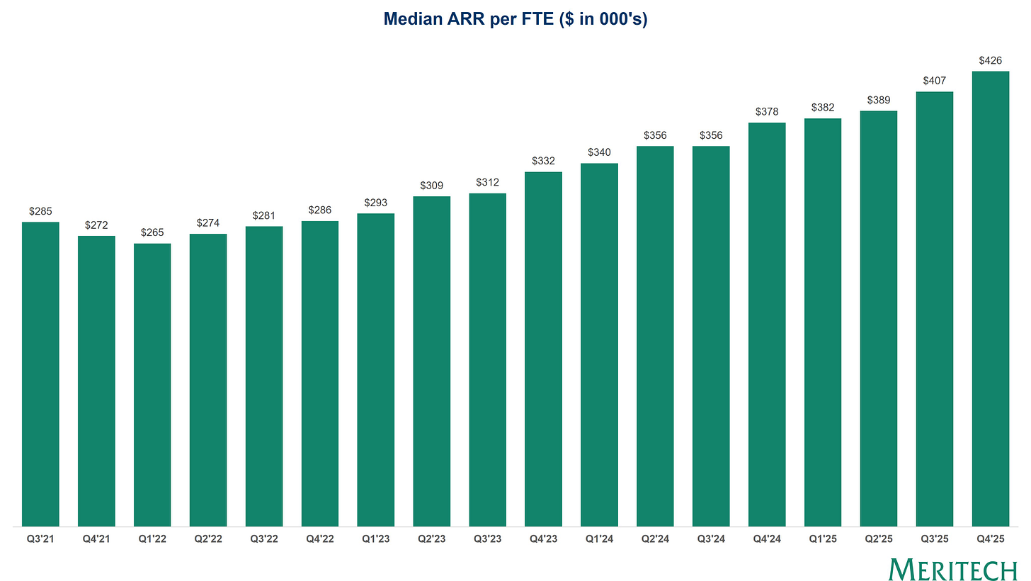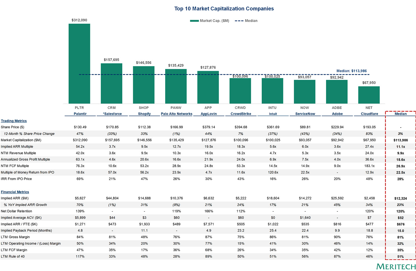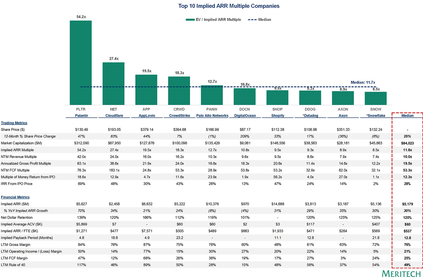 Source: Company Filings and CIQ as of 09-April-2026. Note: Implied ARR defined as quarterly total revenue multiplied by four. Annualized Gross Profit defined as quarterly gross profit multiplied by four. Free cash flow defined as cash flow from operations minus capital expenditures and capitalized software costs. LTM Rule of 40 defined as Implied ARR Growth + LTM free cash flow margin. Payback period shown in months. Payback period calculated as prior quarter LTM non-GAAP sales and marketing expense divided by current quarter LTM net new implied ARR multiplied by current quarter LTM non-GAAP gross margin multiplied by 12. LTM (last-twelve-months) defined as the last four reported quarters. ACV defined as quarterly implied ARR divided by quarterly customer count. All financial figures are non-GAAP which adjust for items such as stock-based compensation, amortization of intangibles, and other one time and/or extraordinary expenses. Historical data includes over 100 public software companies as defined by Meritech. * Indicates current or former Meritech investment.