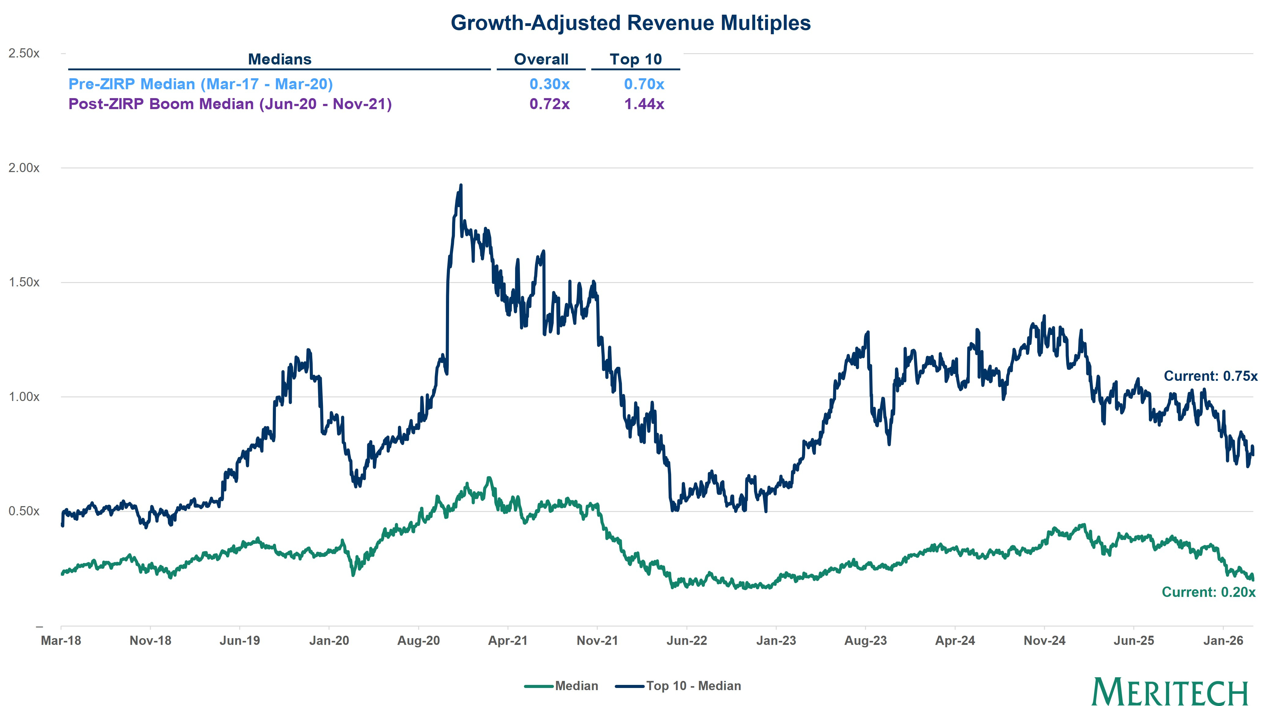 The following chart looks at growth-adjusted revenue multiples for the software market over the last 8 years. The current median multiple is 0.20x, 33% below the pre-ZIRP median of 0.30x but down 80% from the 2021 high of 0.98x. Top 10 multiples have fared even better at 7% above the pre-ZIRP median of 0.70x.