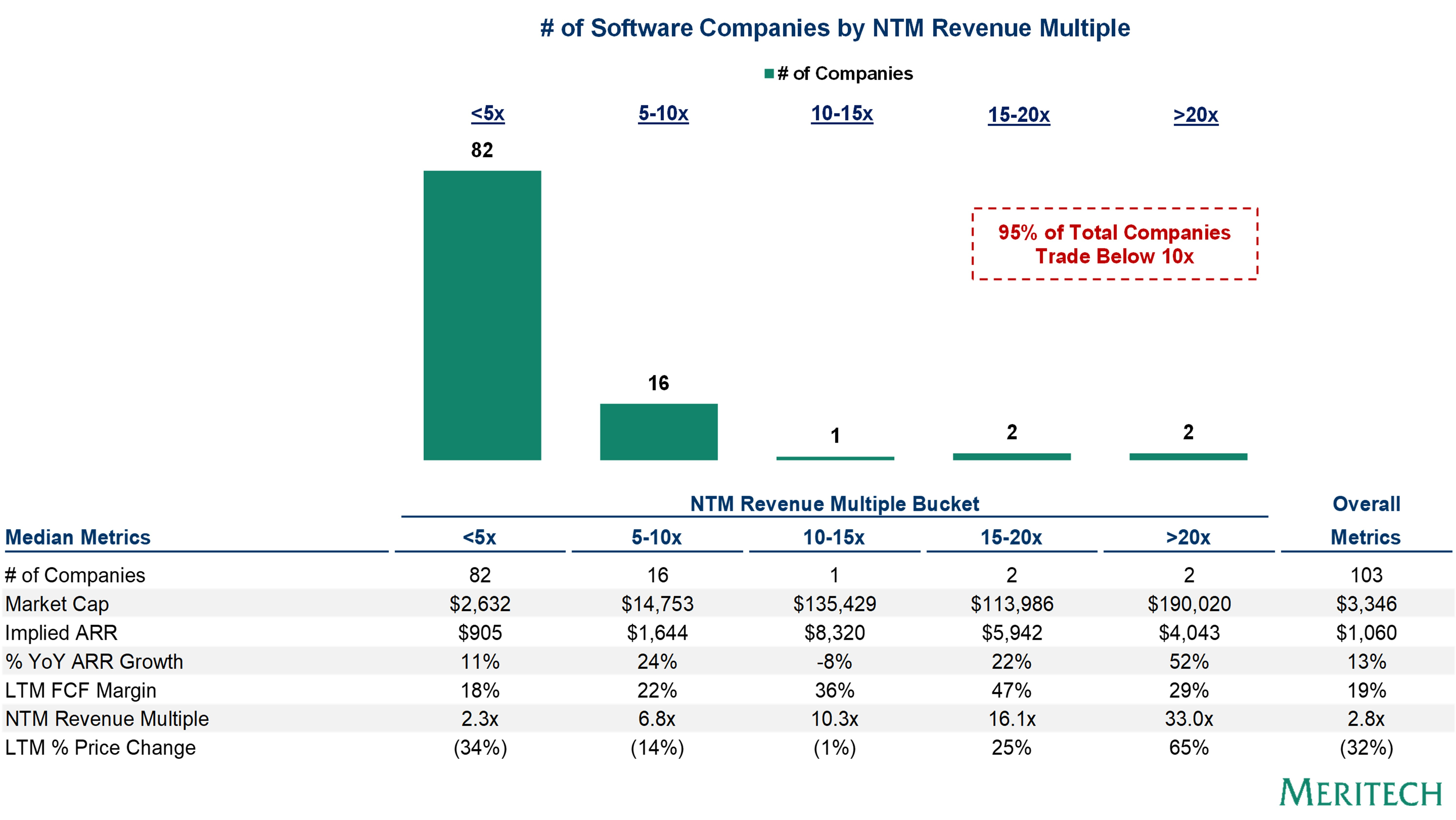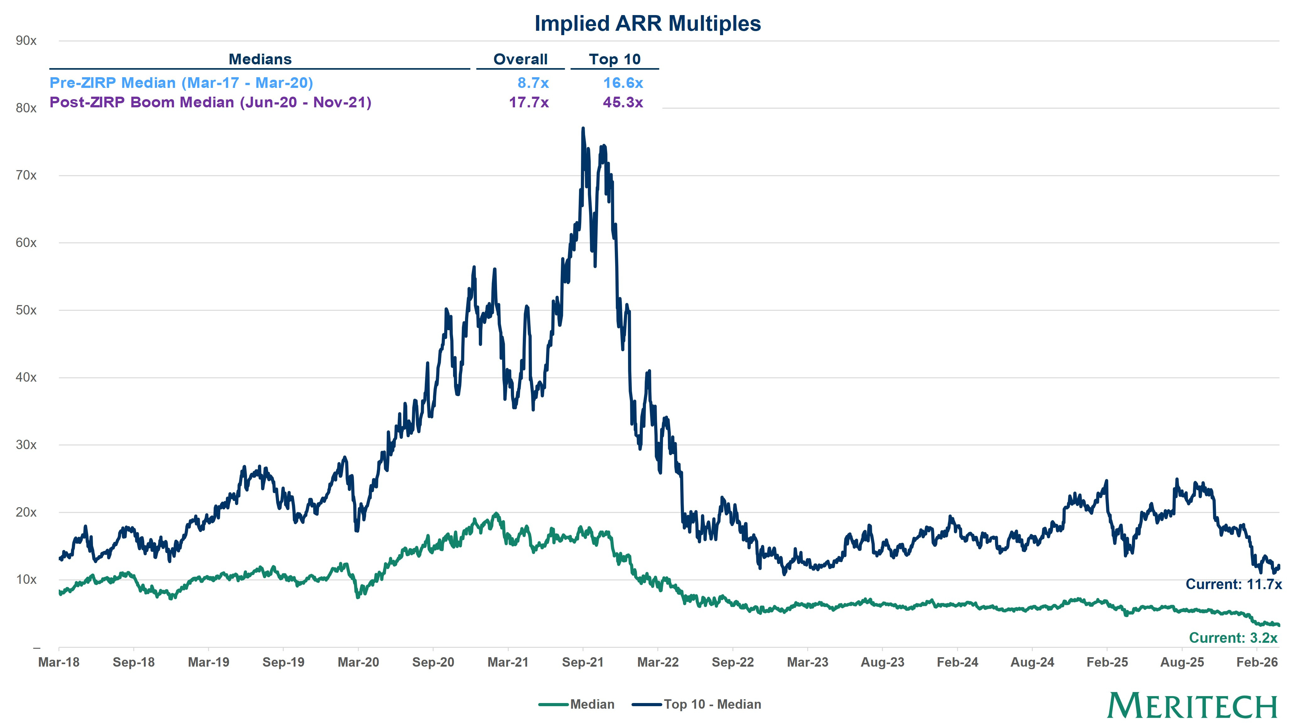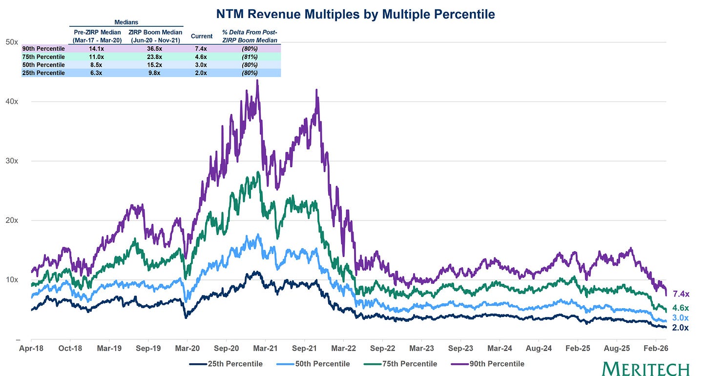 As you can see in our presentation, multiples and valuations — for even the best public software companies — have fallen precipitously. While Anthropic is adding billions in annualized revenue in a single month, most public software companies are struggling to grow revenue more than 15% in a year, and the public market sentiment is extremely bearish. It’s likely the best companies are oversold, and for some, they might not be sold enough. The median company in the index is down a third year-to-date, and the median NTM revenue multiple is now under 3x.