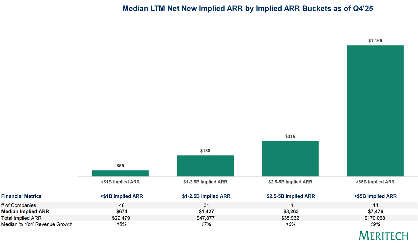 In the below chart, we show the median implied LTM NNARR for software companies based on their implied ARR bucket as of Q4 2025. Most companies with >$5B in implied ARR are adding >$1.1B ARR every year.