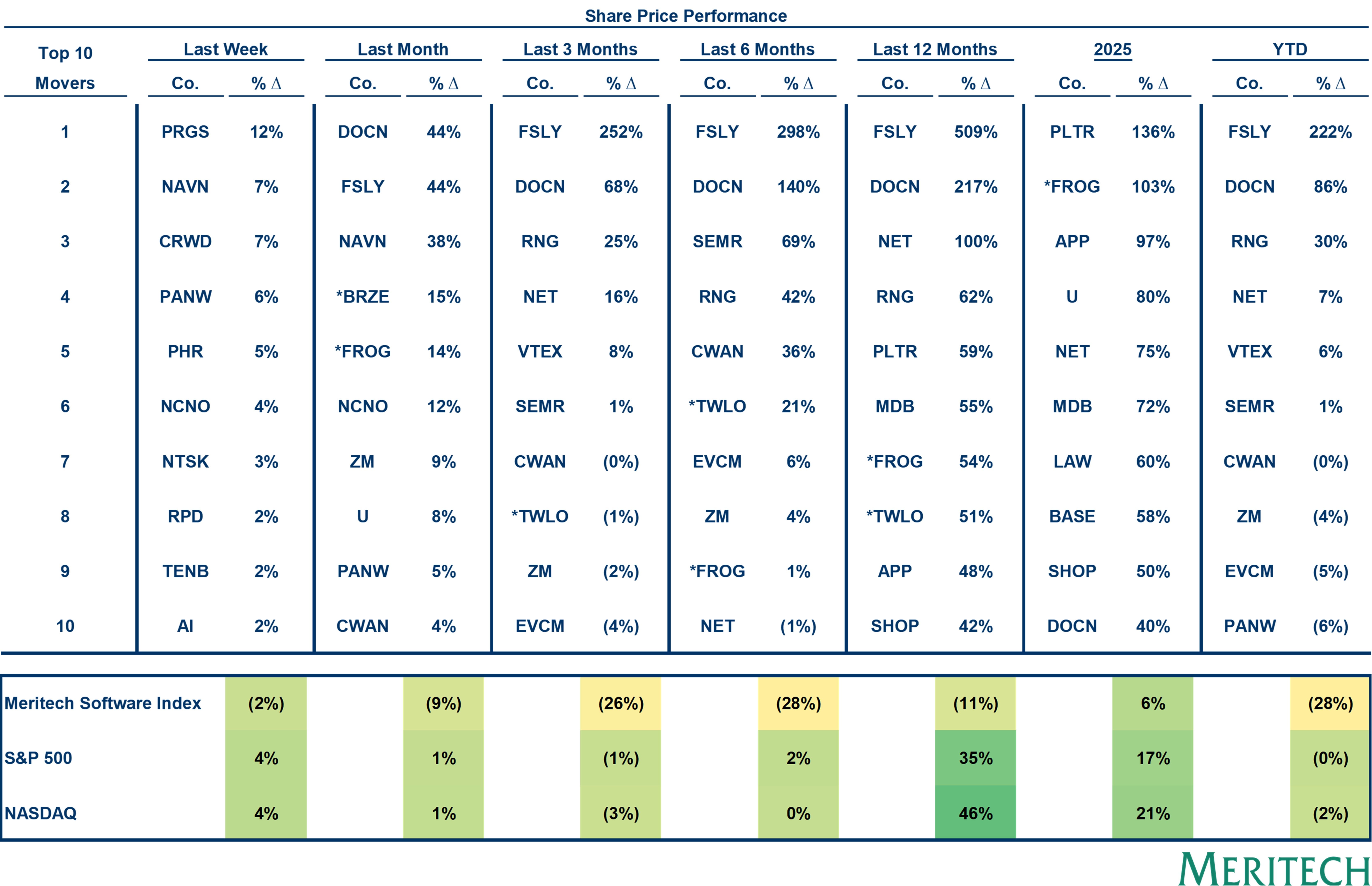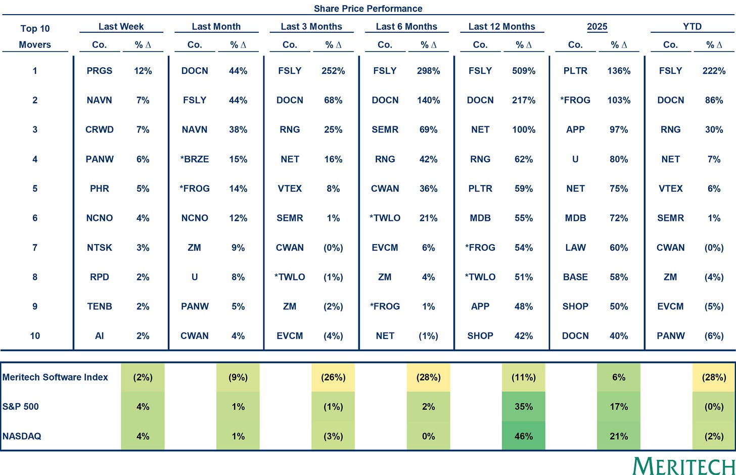 Source: CIQ as of 09-April-2026. Note: Week defined as last 5 trading days, month defined as last 22 trading days, 3 months defined as 65 trading days, 6 months defined as 122 trading days. * Indicates current or former Meritech investment.