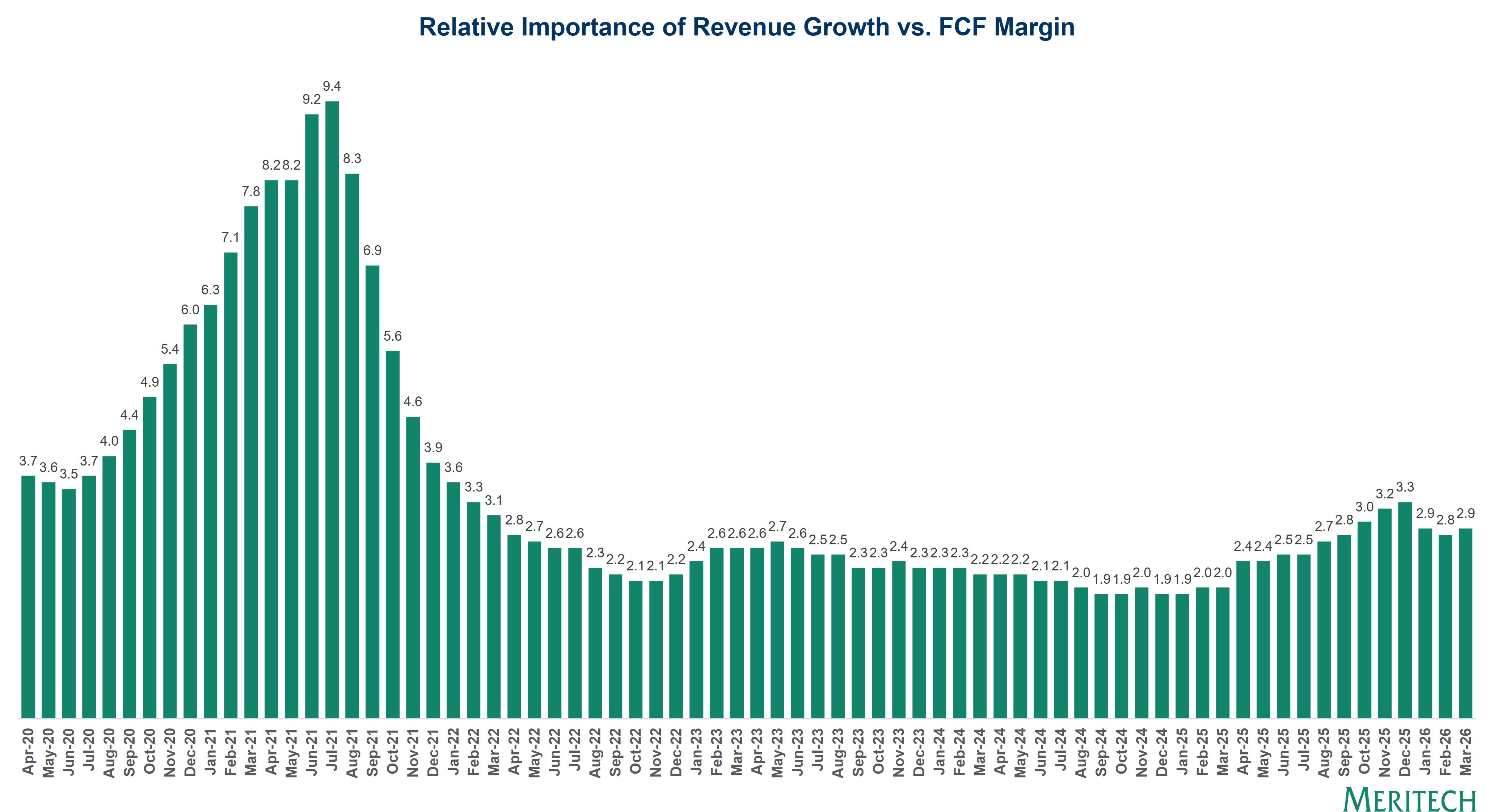 The chart below is based on a two-factor regression of NTM revenue growth and NTM FCF margin to ARR multiple. It shows that growth is 2.9x as correlated with multiple vs. FCF margin. Said another way, a 1% increase in growth would have the same impact on multiple as a 2.9% increase in FCF margin.