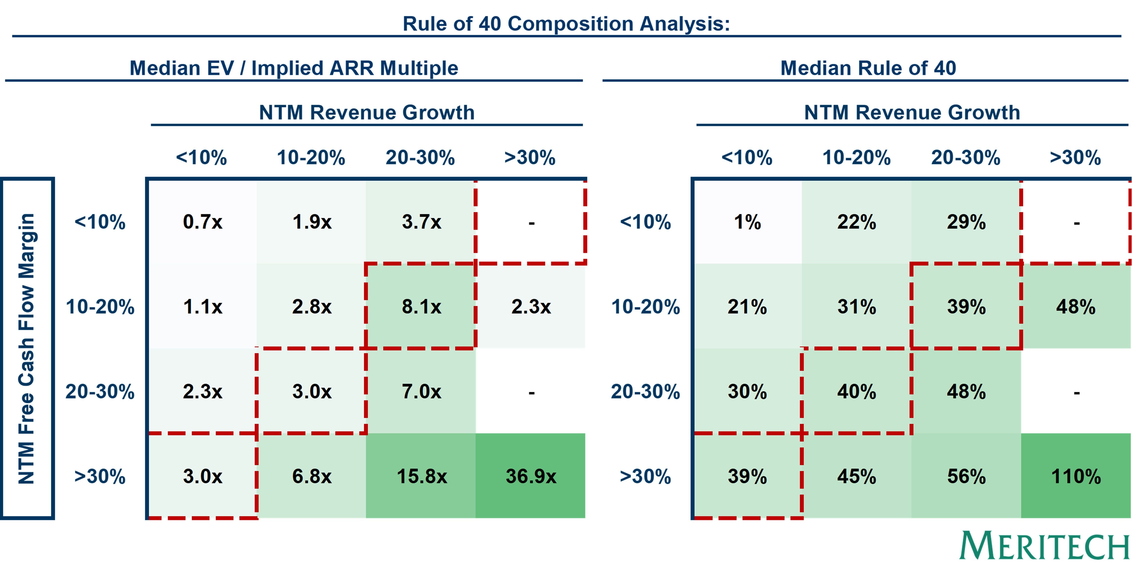 Previously, we showed multiples segmented by growth rate and profitability. Here is a more nuanced view, breaking down the composition of the Rule of 40 between growth and cash flow margins and showing both the median multiple and the median Rule of 40 of each bucket. Simple regressions comparing multiples against growth or Rule of 40 are valuable, but this analysis shows that the composition of your Rule of 40 can meaningfully impact your valuation. This is highlighted in the red boxes in the tables, which show that companies with similar Rule of 40 but growing faster can trade at a significant premium (8.1x) to companies with lower growth and higher free cash flow margins (3.0x). This shows the market rewards growth above all in the Rule of 40 calculation.