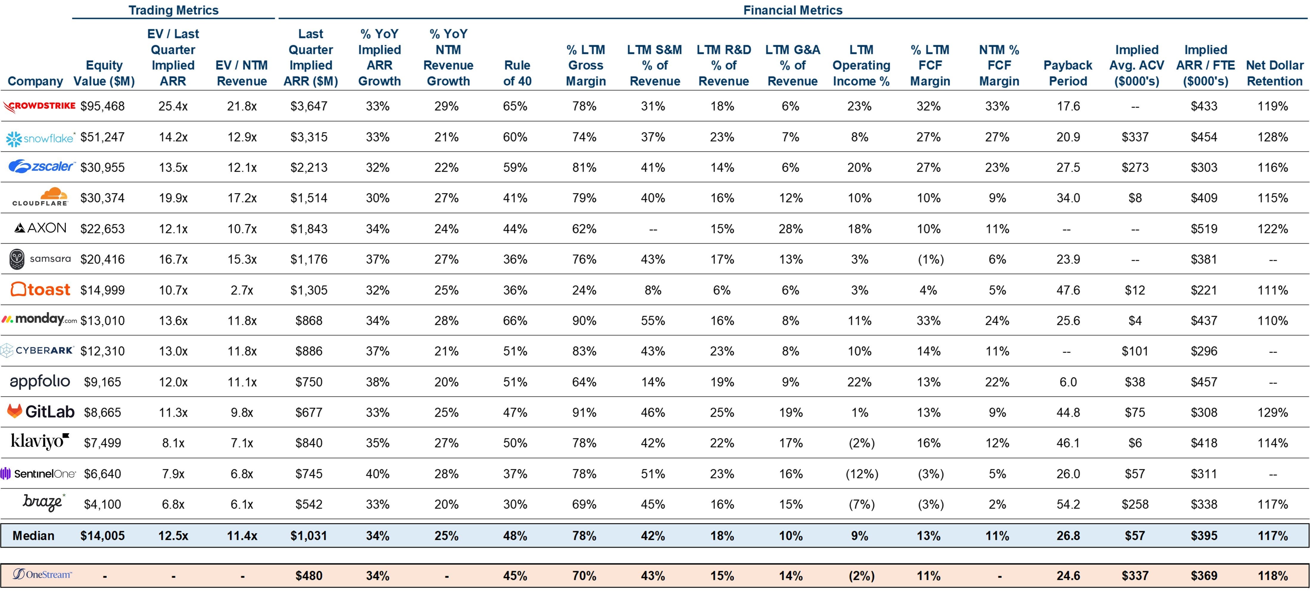 We calculate the Meritech Rule of 40 for OneStream using an illustrative forward ARR growth, not revenue growth. OneStream reports ARR, which is a leading indicator vs. revenue, which is a lagging indicator for a SaaS company.