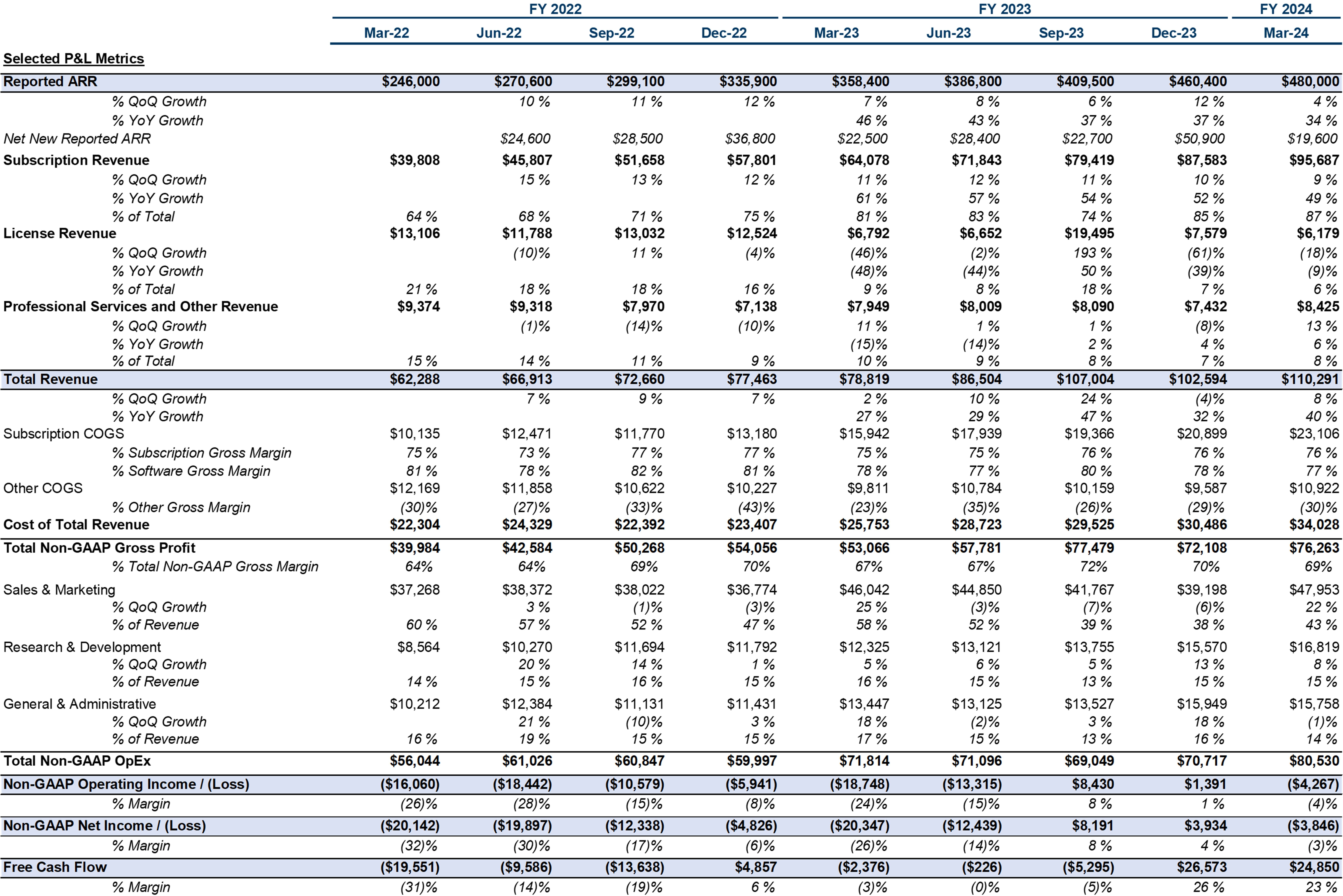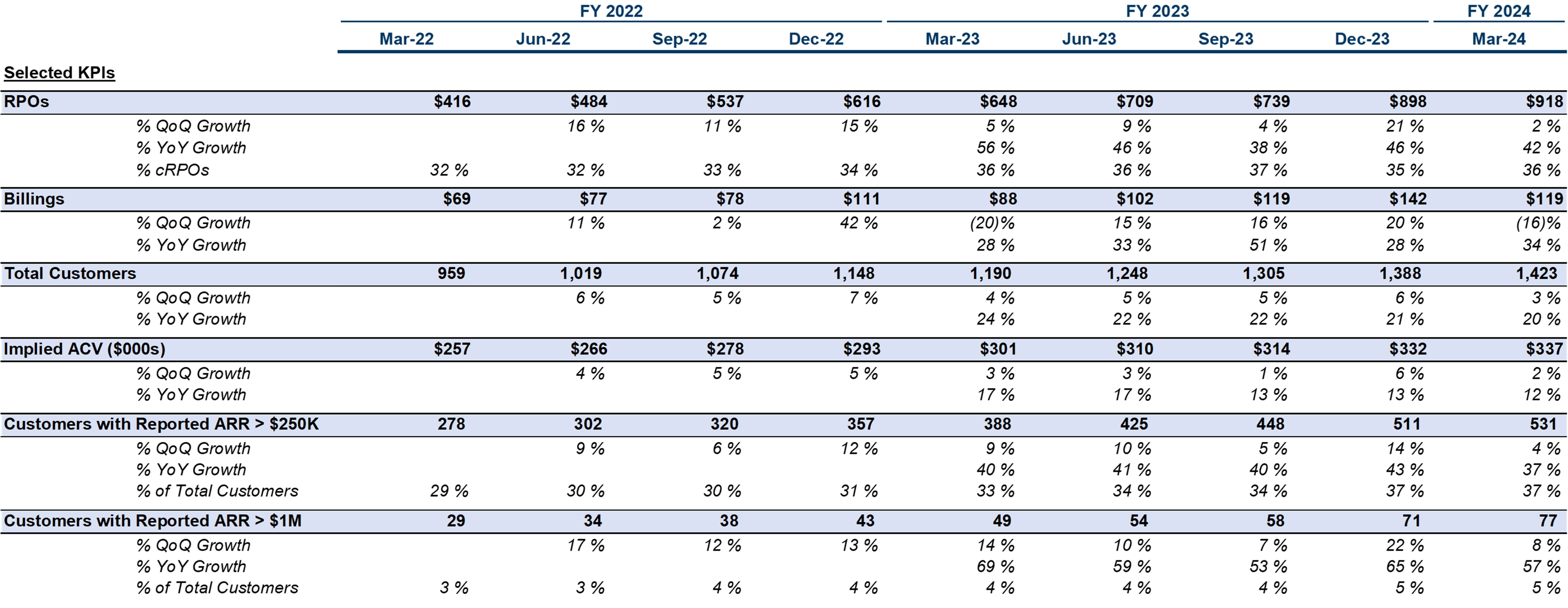 Source: Company filings and CIQ as of 05-Jul-2024. Note: Implied ARR defined as quarterly total revenue multiplied by four. Free cash flow defined as cash flow from operations minus capital expenditures and capitalized software costs. Rule of 40 defined as Implied ARR Growth + LTM free cash flow margin. Payback period shown in months. Payback period calculated as prior quarter non-GAAP sales and marketing expense divided by current quarter net new implied ARR multiplied by current quarter non-GAAP gross margin multiplied by 12. LTM (last-twelve-months) defined as the last four reported quarters. ACV defined as quarterly implied ARR divided by quarterly customer count. All financial figures are non-GAAP which adjust for items such as stock-based compensation, amortization of intangibles, and other one time and/or extraordinary expenses