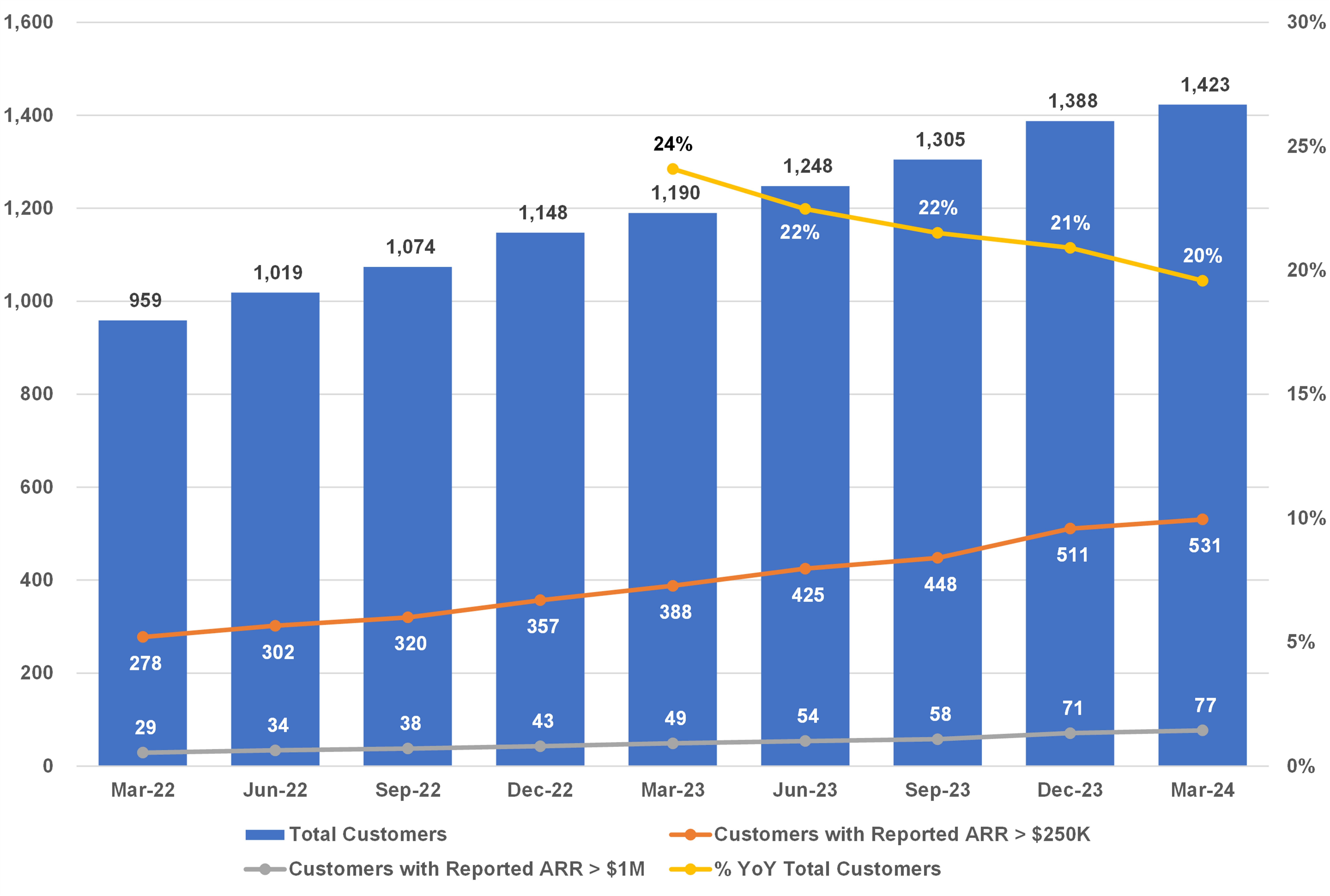 The company ended Q1 with 1,423 total customers, up 20% year-over-year. This included 77 $1M+ ACV customers, which is up 57% year-over-year