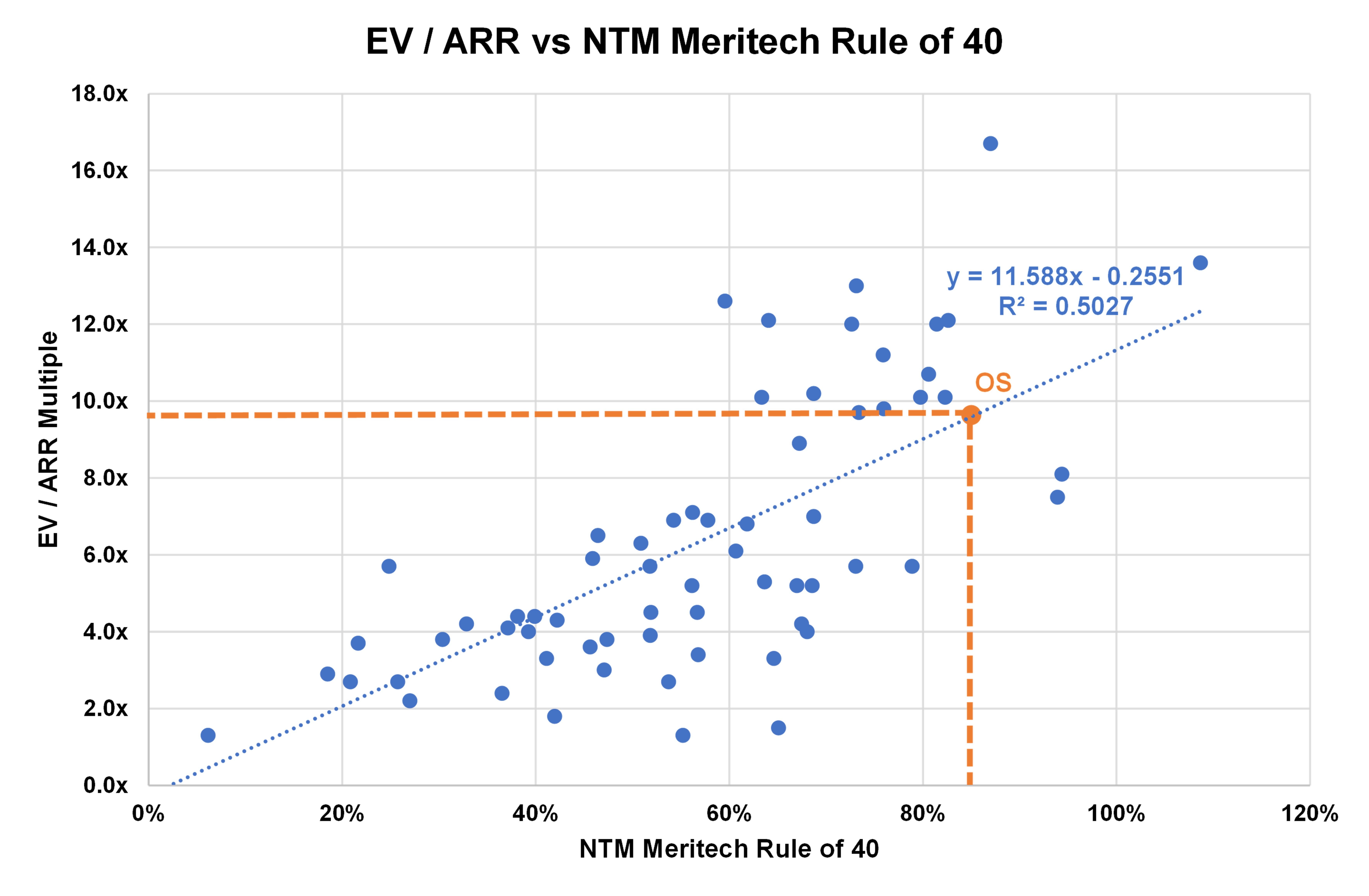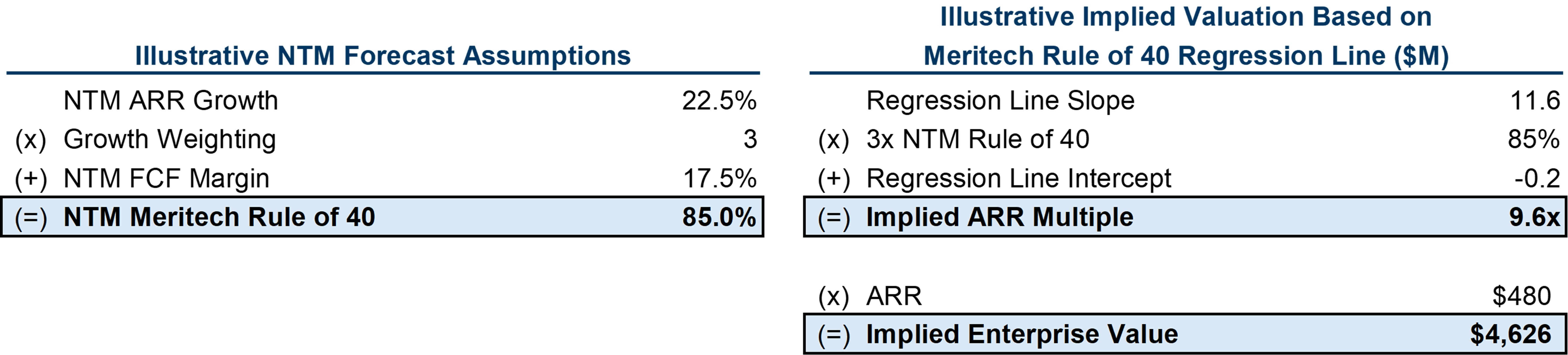 We assumed 22.5% NTM ARR growth (down from 34% LTM) and a 17.5% FCF margin. Our assumptions result in an implied Meritech Rule of 40 of 85%. We then “plot” that figure on the regression line using the simple “y = mx + b” equation representing the line. This calculation implies that OneStream could trade at 9.6x ARR, representing a $4.6B enterprise value.