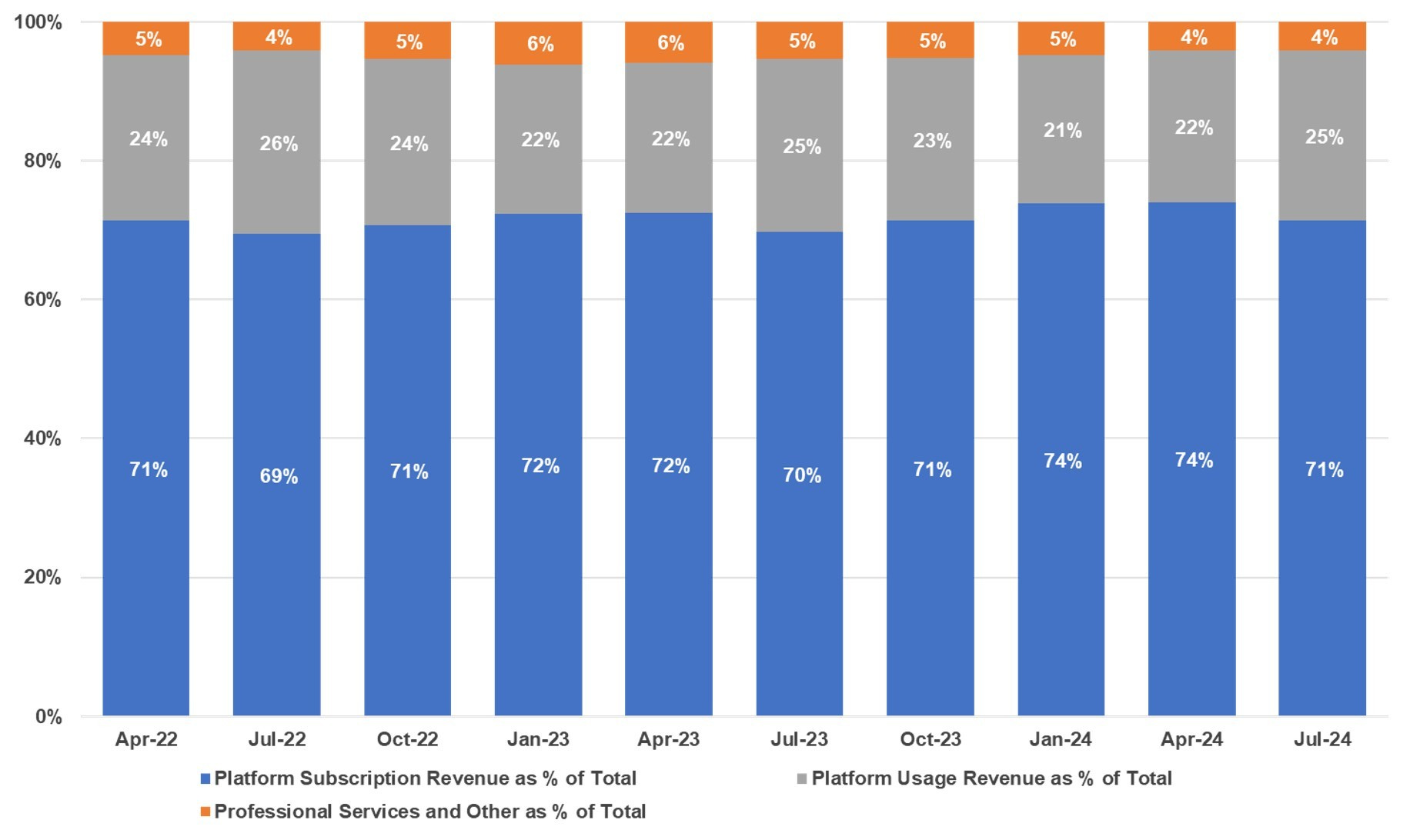 In the most recent quarter, Platform Subscription revenue represented 71% of total revenue, Platform Usage Revenue (payments) represented 25% and Professional Services and Other was 4%