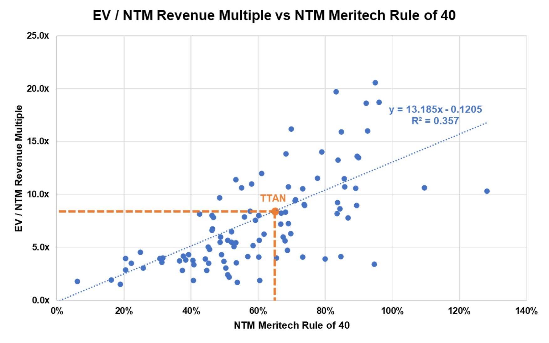 High-growth SaaS companies trade on multiples of revenue. As we’ve established in our bi-weekly Meritech Pulse, multiples are most highly correlated to what we call the “Meritech Rule of 40”, defined as 3x NTM revenue growth + NTM free cash flow margin. Said another way, growth has roughly three times the impact on the valuation of a public SaaS company vs. profitability (defined as free cash flow margin), and this metric appropriately captures that weighting. Today’s investors want high growth with “some” free cash flow. With this in mind, we believe the most accurate way to understand where a SaaS company might trade in the public markets is simply to plot it on the regression line comparing multiples and the Meritech Rule of 40. That’s what we’ve done below. The blue dots represent all our index’s current public comps (100+ of them). The orange dot represents ServiceTitan based on illustrative assumptions for its NTM financial performance (companies do not give guidance in their S-1s):