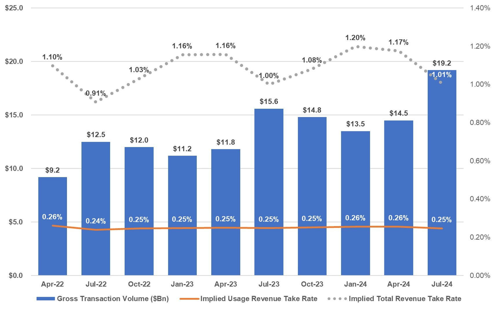 Gross Transaction Volume and Implied Take Rate ($B)