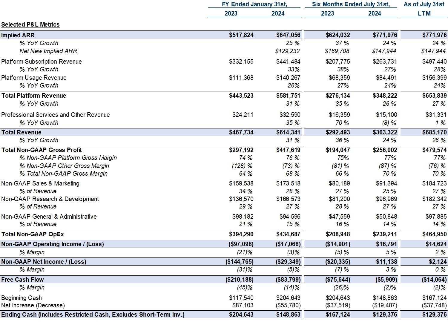 Source: Company filings and CIQ as of 15-Nov-2024. Note: Implied ARR defined as quarterly total revenue multiplied by four. Free cash flow defined as cash flow from operations minus capital expenditures and capitalized software costs. Rule of 40 defined as LTM revenue growth + LTM free cash flow margin. LTM (last-twelve-months) defined as the last four reported quarters. LTM payback period shown in months. Payback period calculated as prior LTM non-GAAP sales and marketing expense divided by LTM new implied ARR multiplied by LTM non-GAAP gross margin multiplied by 12. LTM magic number calculated as LTM net new implied ARR divided by LTM non-GAAP sales and marketing expense. All financial figures are non-GAAP which adjust for items such as stock-based compensation, amortization of intangibles, and other one time and/or extraordinary expenses