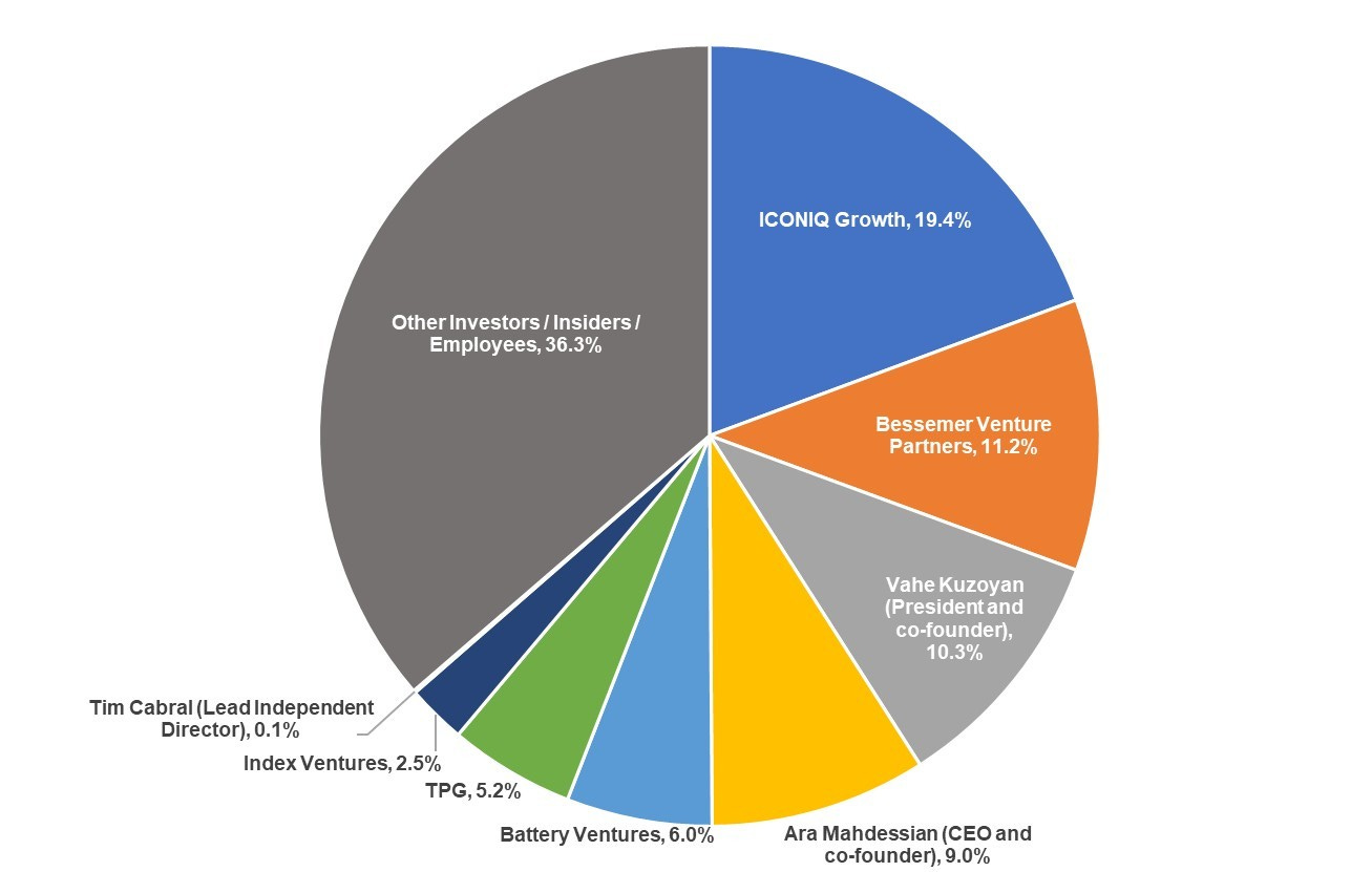 Source: S-1. Note: Assumes Ara Mahdessian and Vahe Kuzoyan have the same beneficially owned shares as disclosed in the S-1. This assumes they both exercise their options to each purchase ~1M shares of Class B common stock. Ownership percentages based on total Class A and Class B basic shares outstanding plus both the co-founders’ ~1M options to purchase Class B common stock.
