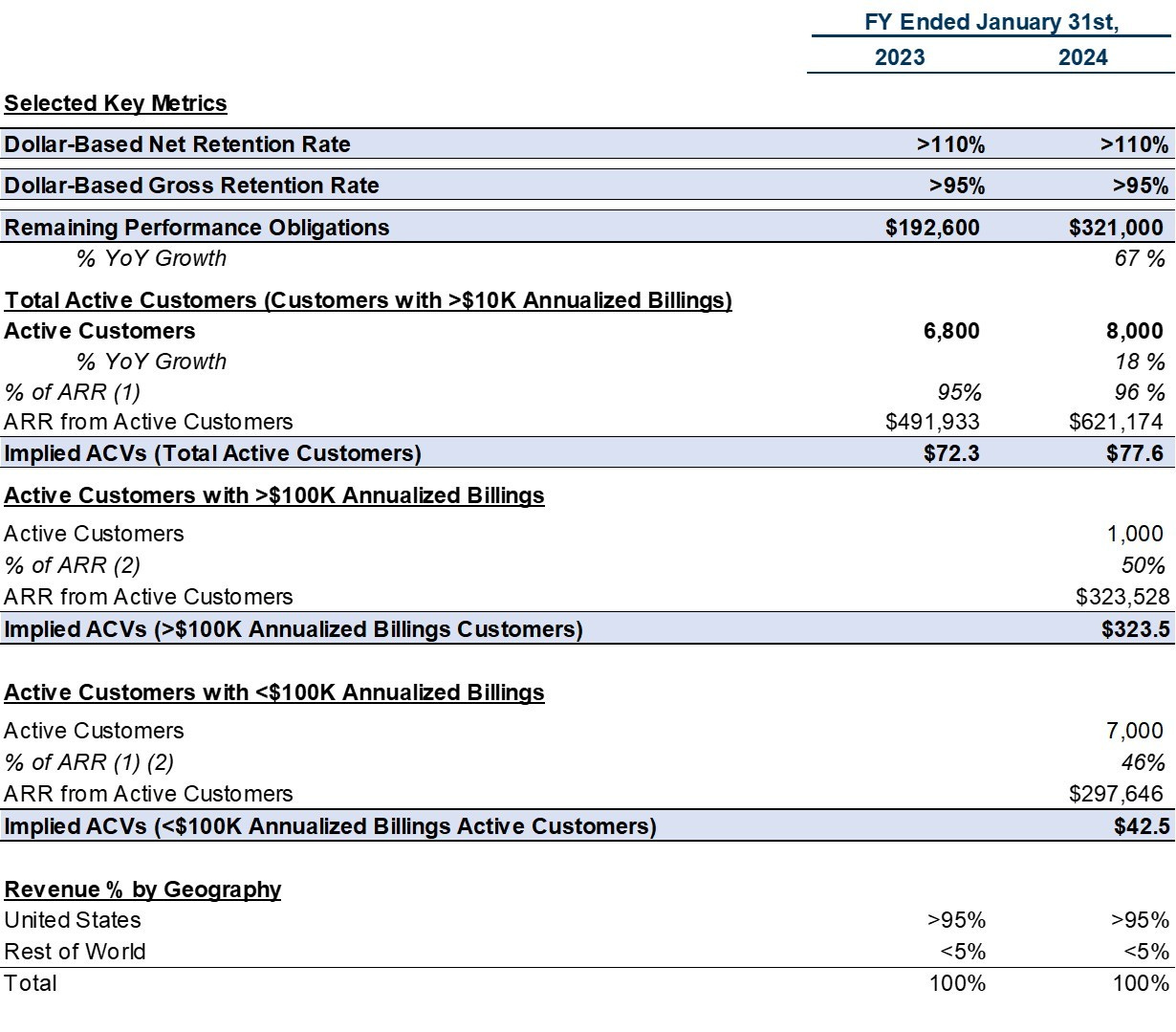 As of 2024, over 1,000 customers have annualized billings that are >$100,000, which has doubled since 2022. These customers represent over 50% of total annualized billings