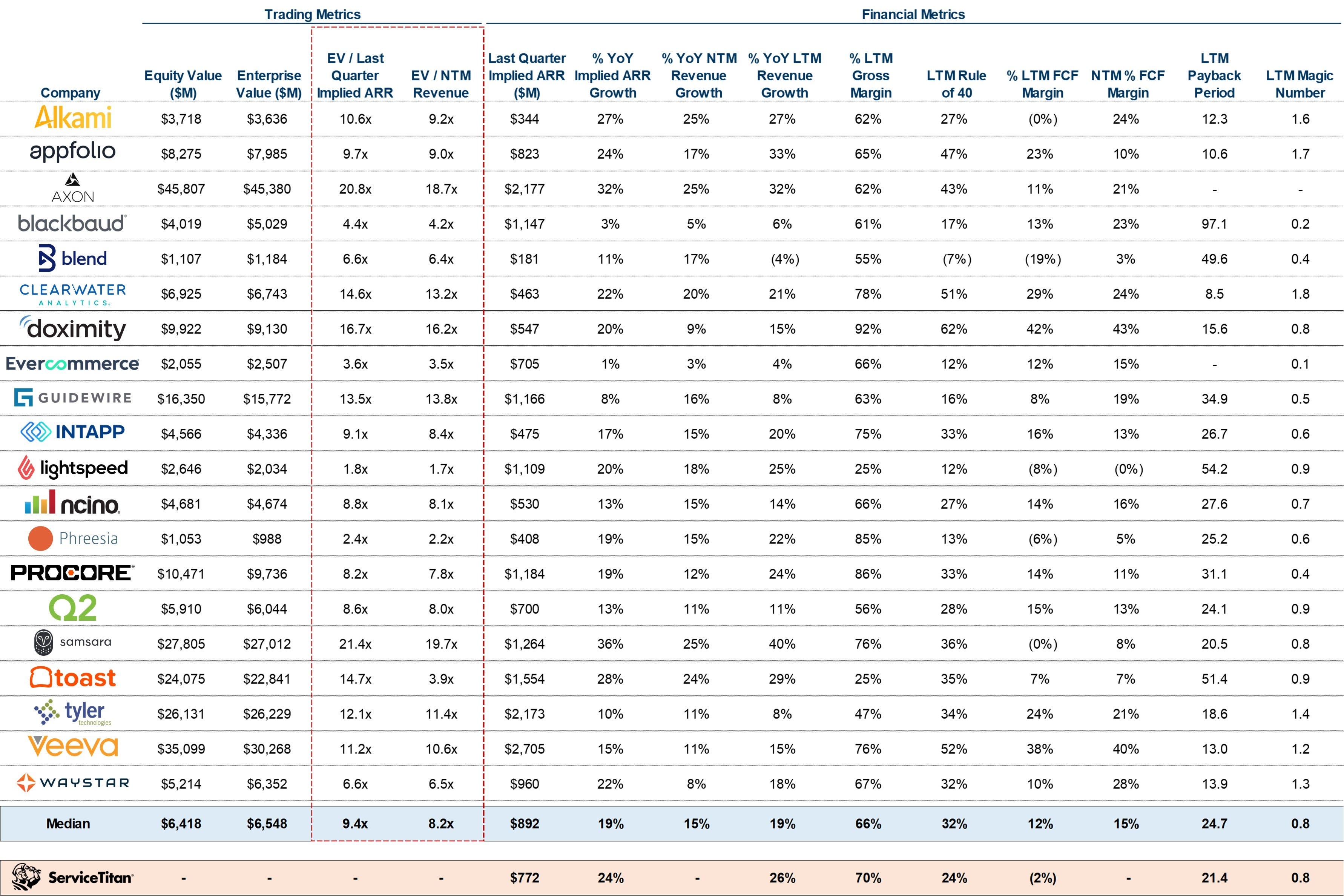 Below we include a table showing the multiples and financial metrics of select currently public vertical SaaS companies, with whom ServiceTitan will be compared. On a median-basis, ServiceTitan is growing a bit faster but has a lower Rule of 40 score. The median company trades at 9.4x ARR and 8.2x NTM revenue, similar to where we have pegged ServiceTitan in our valuation output.
