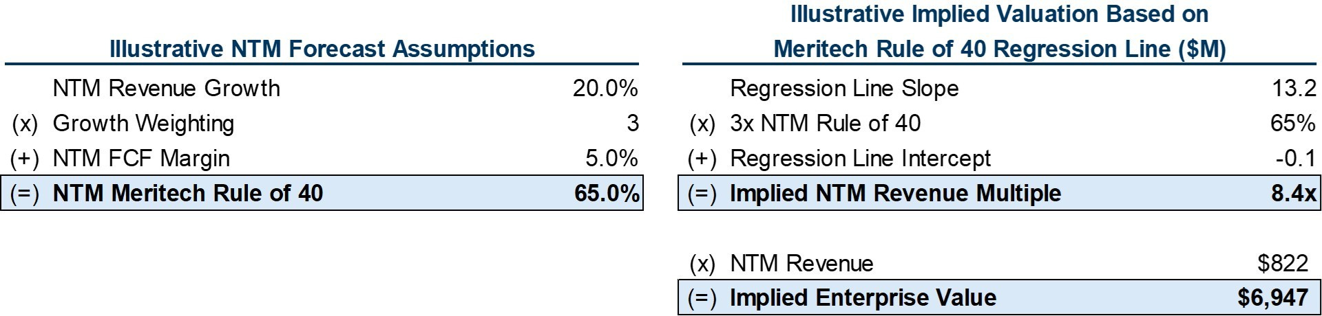 Again, these are illustrative assumptions since we don’t have forward projections. This results in an implied Meritech Rule of 40 for ServiceTitan of 65%. We then “plot” that figure on the regression line using the “y = mx + b” equation representing the line. This calculation implies that ServiceTitan could trade at 8.4x NTM Revenue, representing a $6.9B enterprise value.